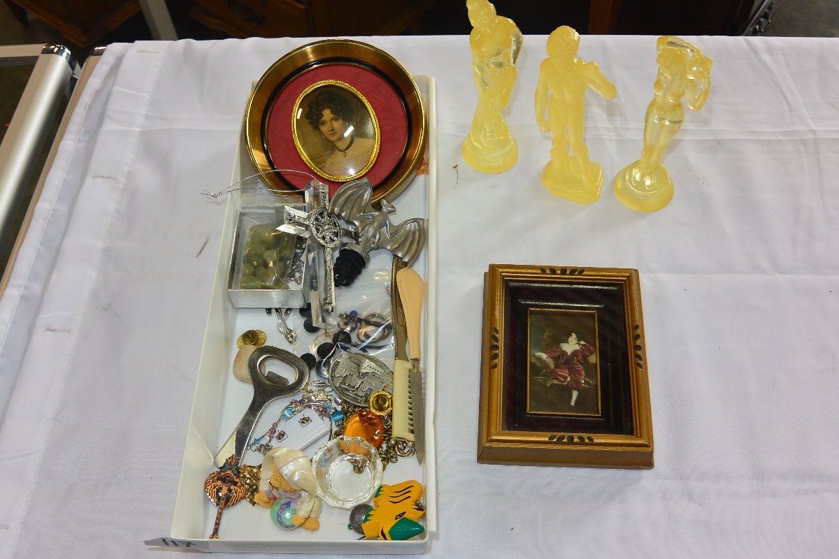 TRAY OF COLLECTIBLES FIGURES PICTURES ETC