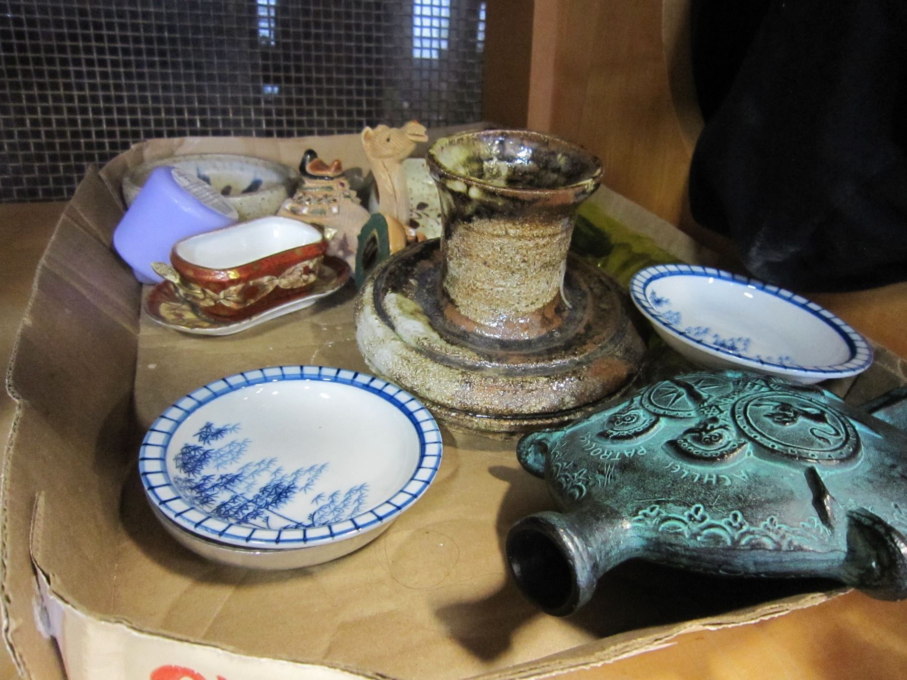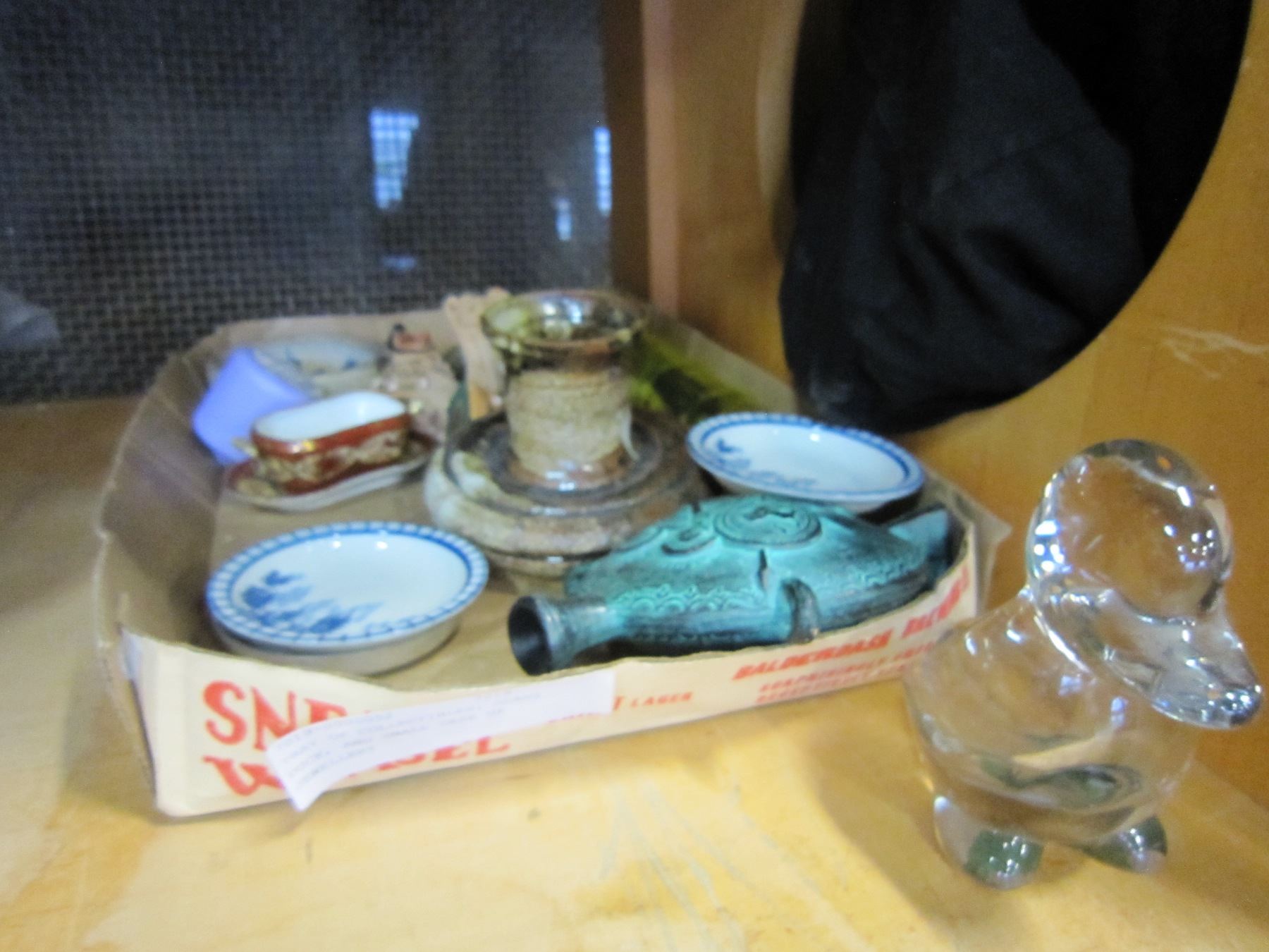 TRAY OF COLLECTIBLES, GLASS DUCK, AND SMALL CASE OF JEWELLERY