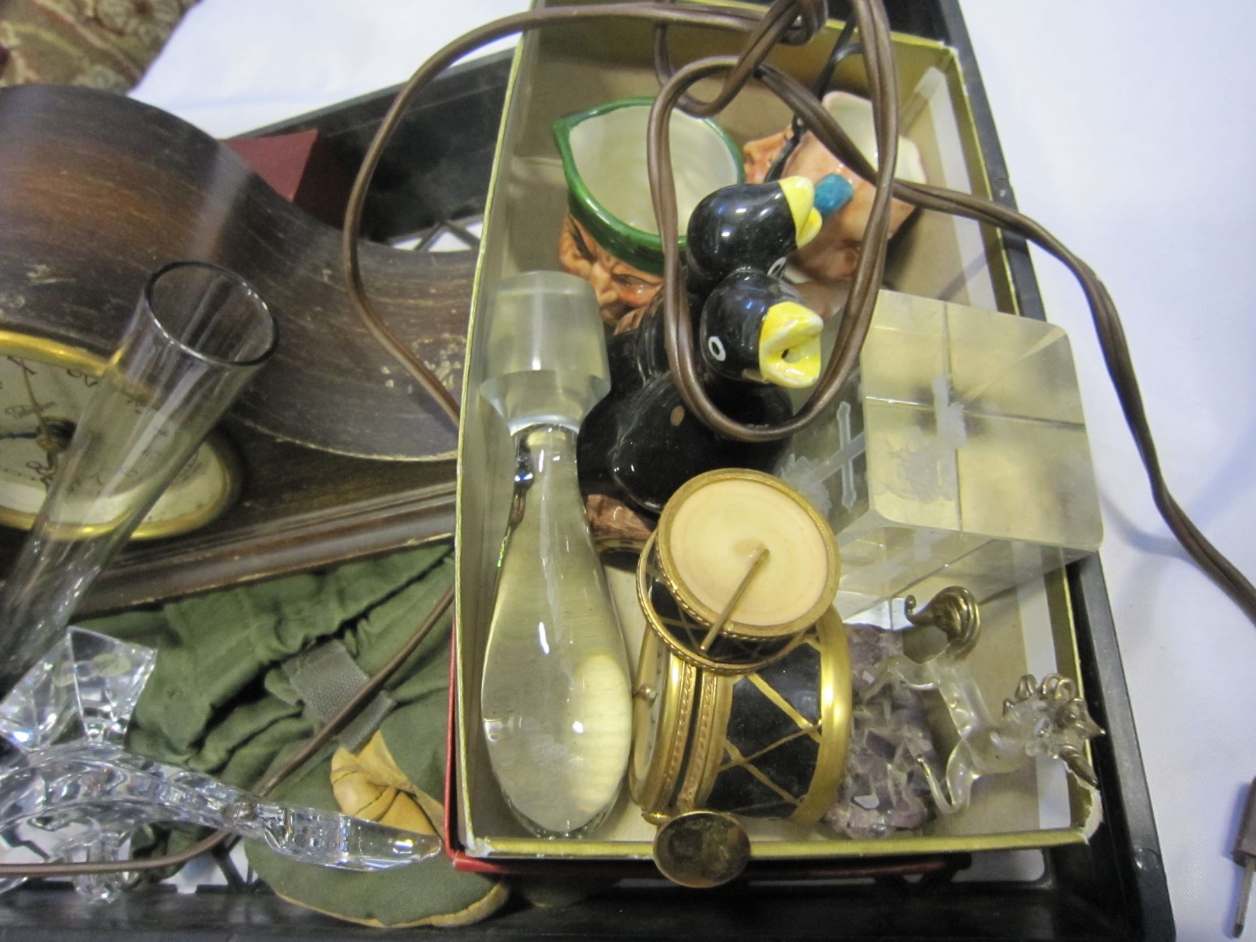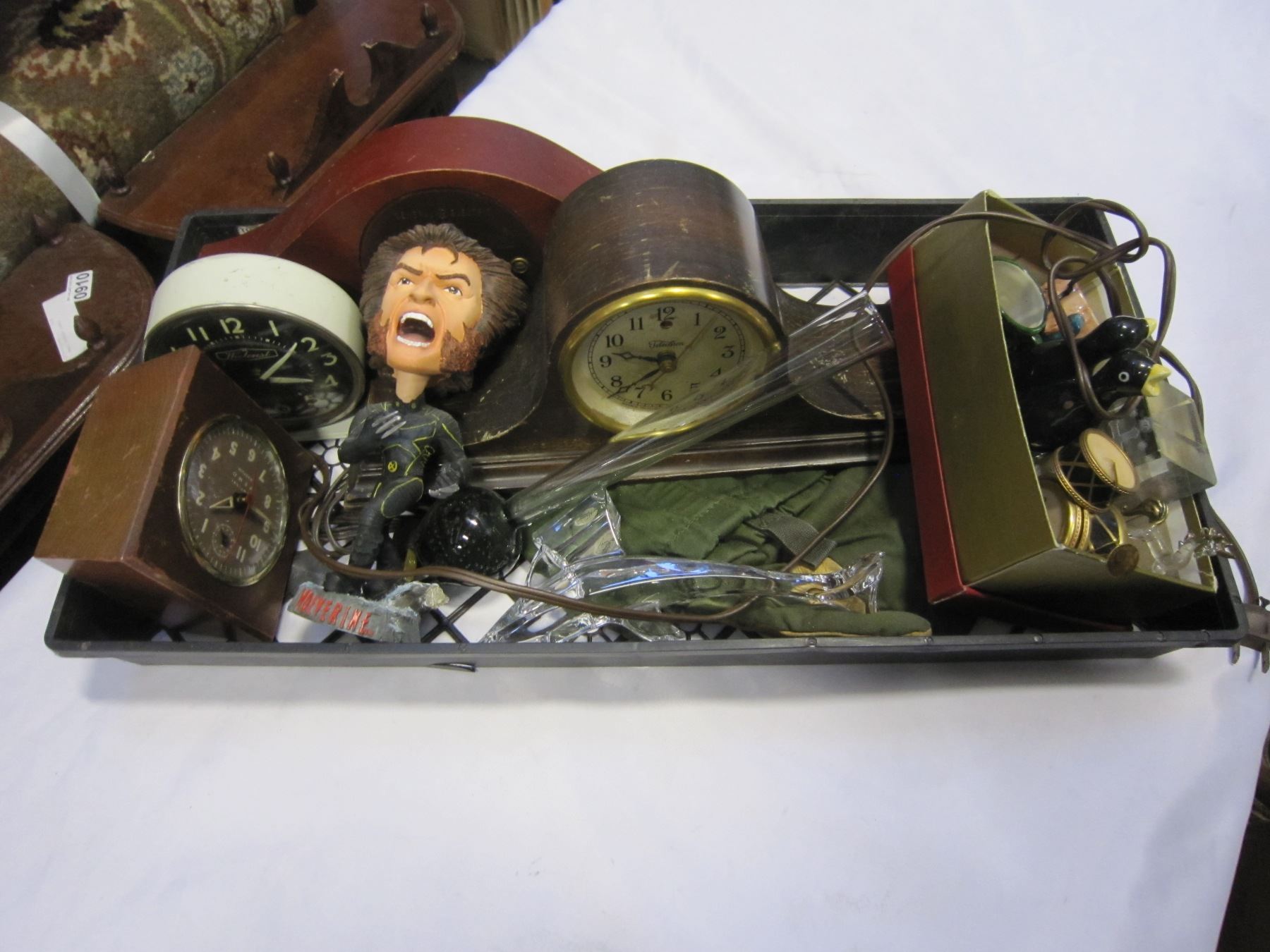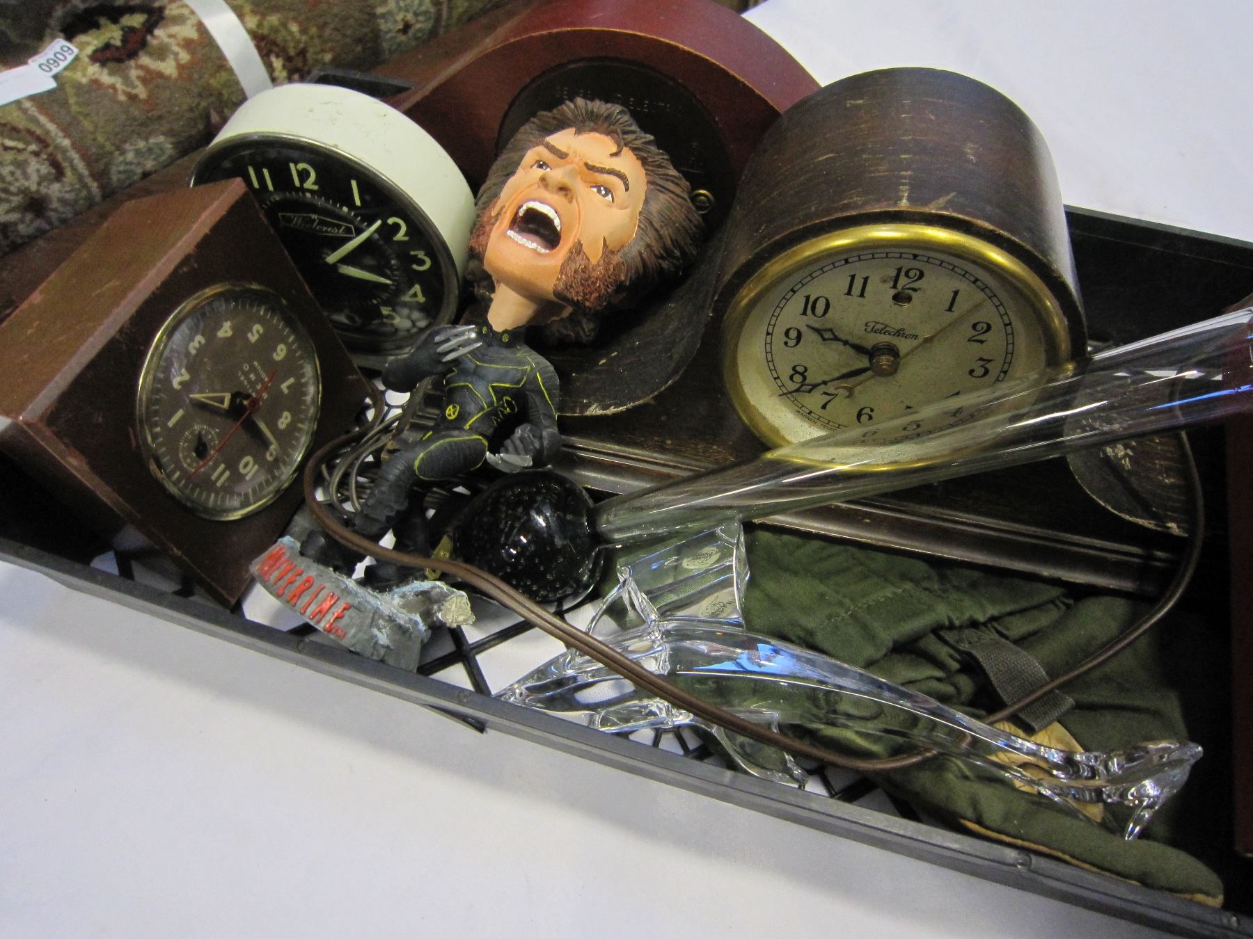 TRAY OF COLLECTIBLES, MANTLE CLOCKS, AND WOLVERINE BOBBLE HEAD