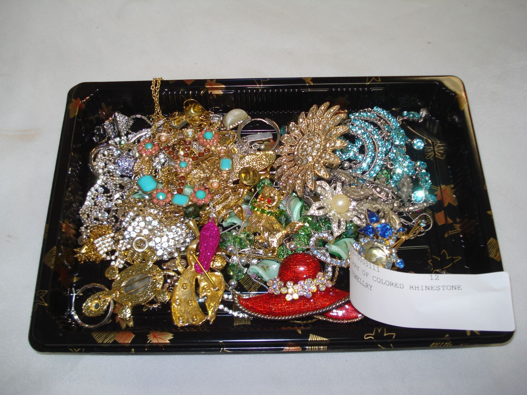 TRAY OF COLORED RHINESTONE JEWELLRY