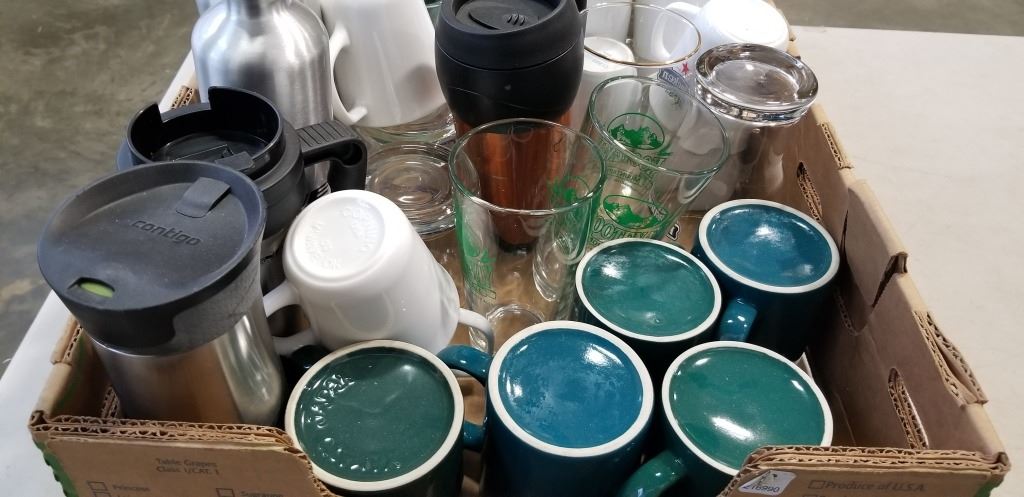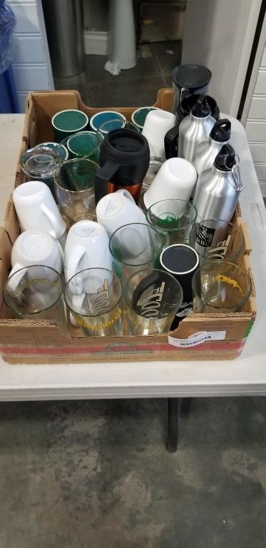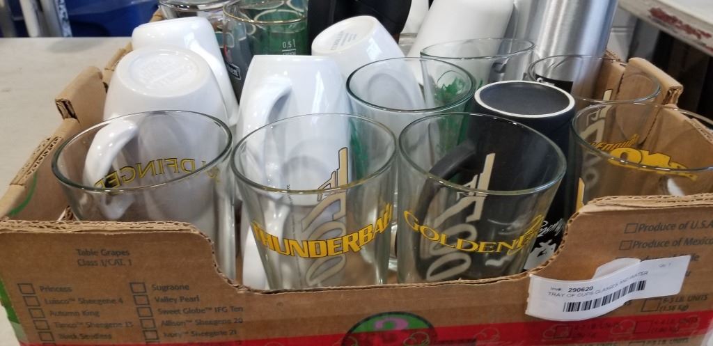 TRAY OF CUPS GLASSES AND WATER BOTTLES