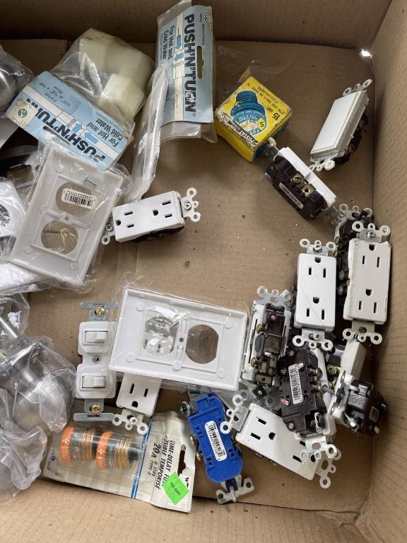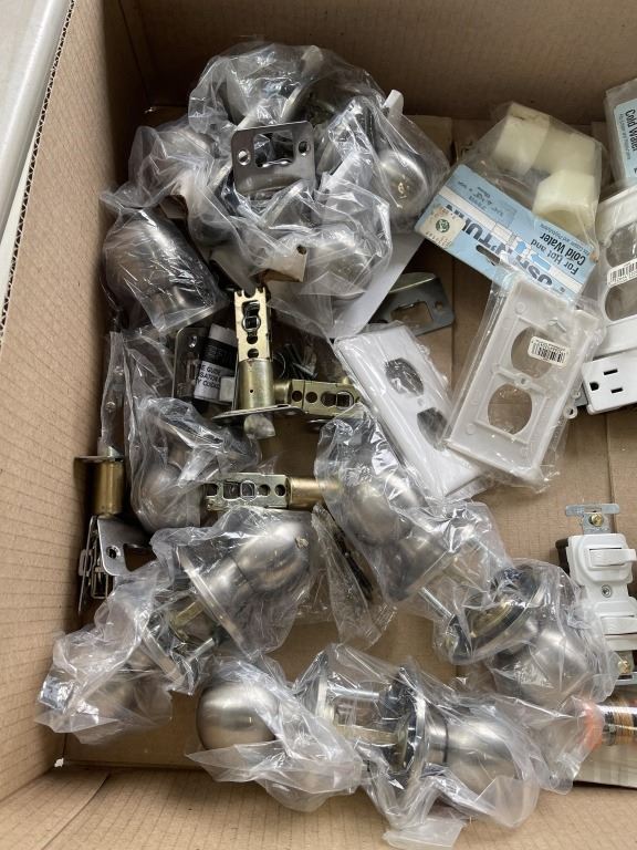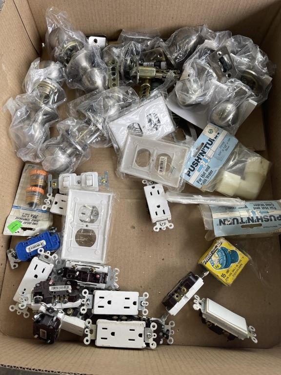 TRAY OF DOOR KNOBS AND ELECTRICAL