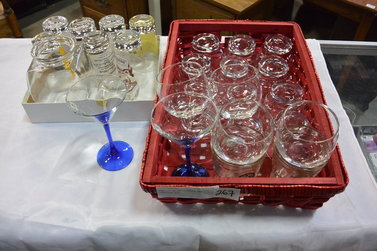 TRAY OF DRINK GLASSES AND TUMBLERS ETC