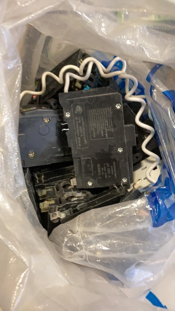 TRAY OF ELECTRICAL BREAKERS AND HARDWARE