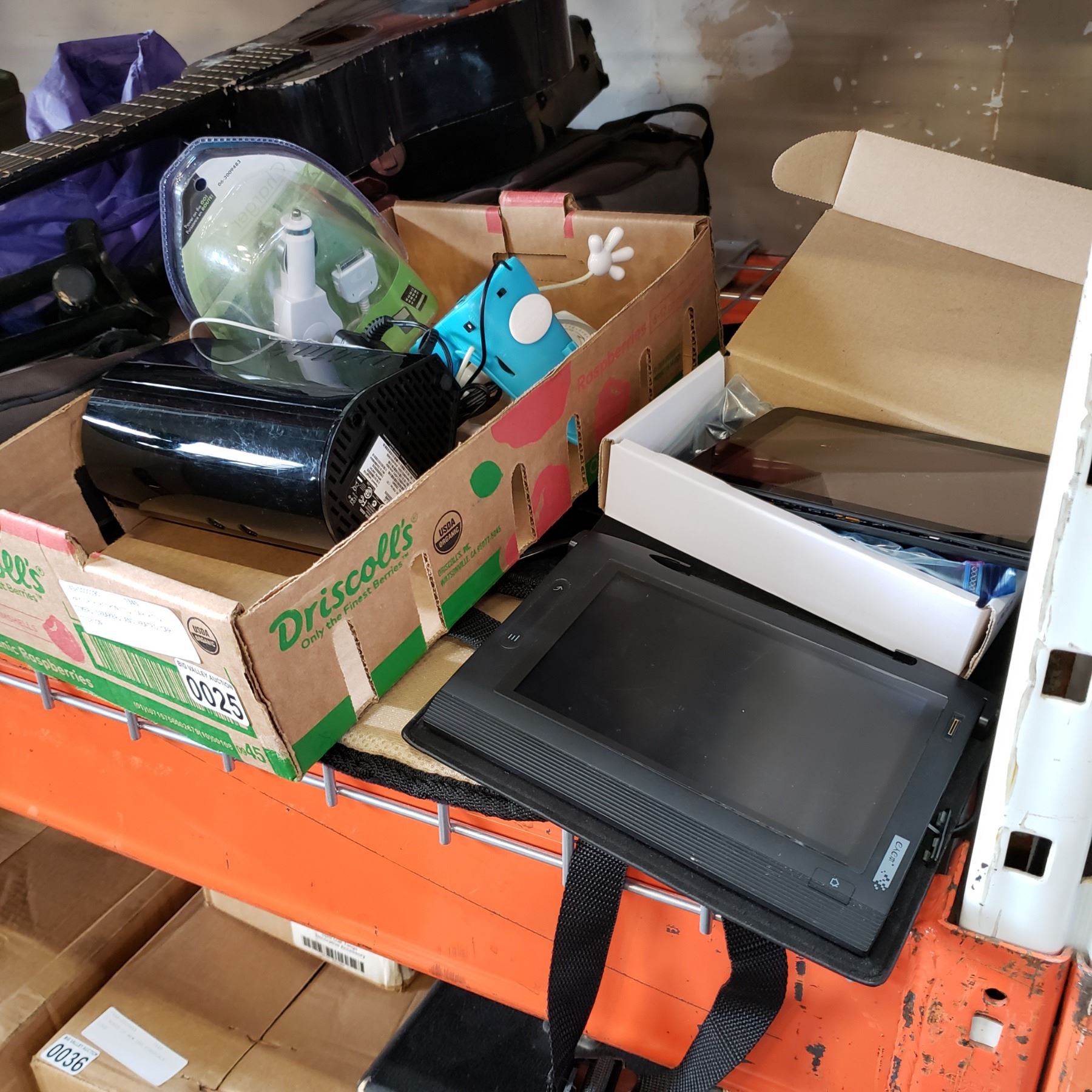 TRAY OF ELECTRONICS, TABLETS, TIMER, SPEAKER, AND HEATED CAR CUSHION