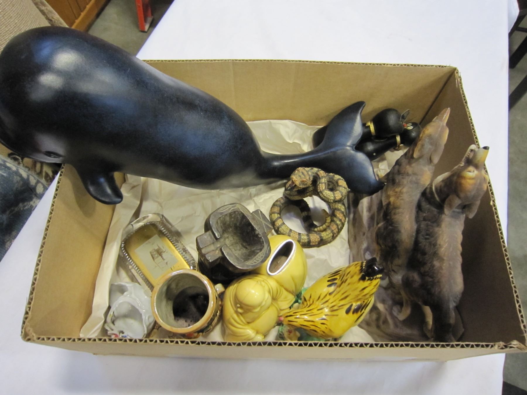 TRAY OF FIGURES, WHALE FIGURE, AND COLLECTIBLES
