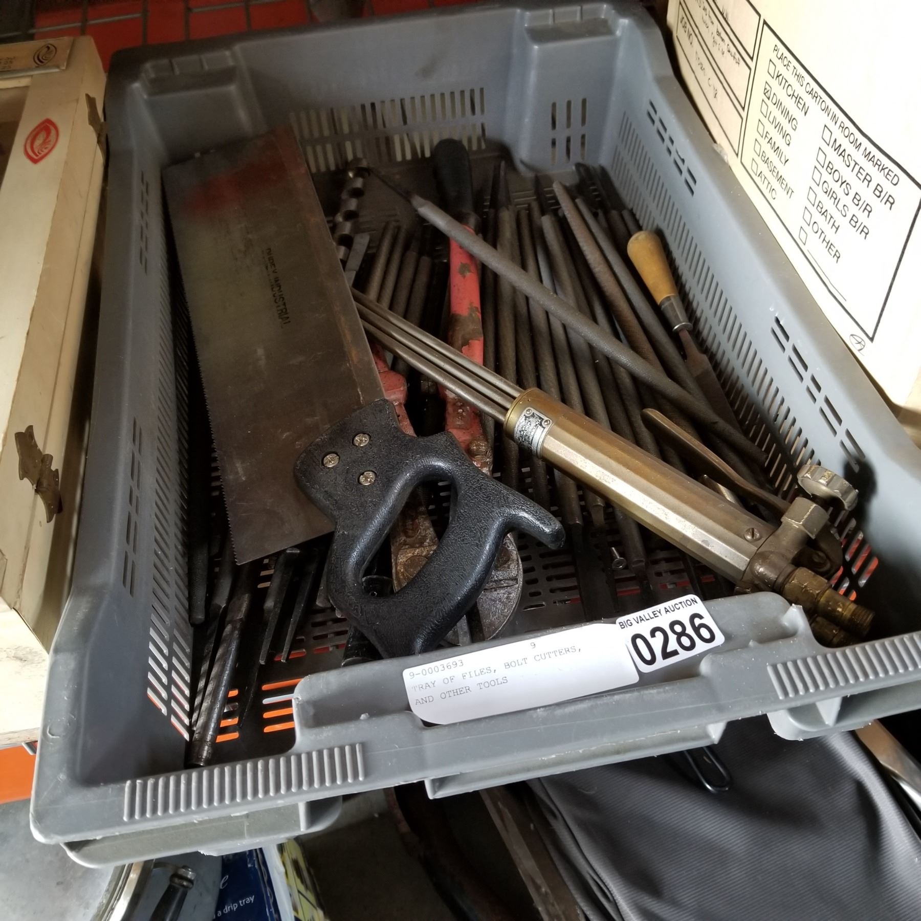 TRAY OF FILES, BOLT CUTTERS, AND OTHER TOOLS