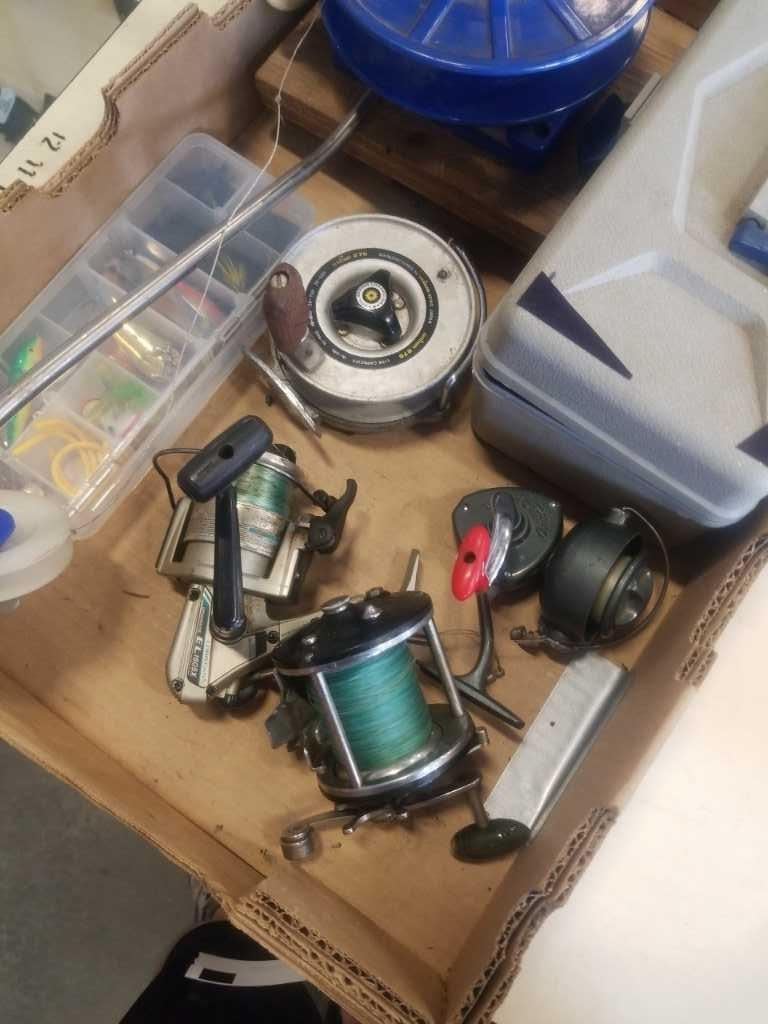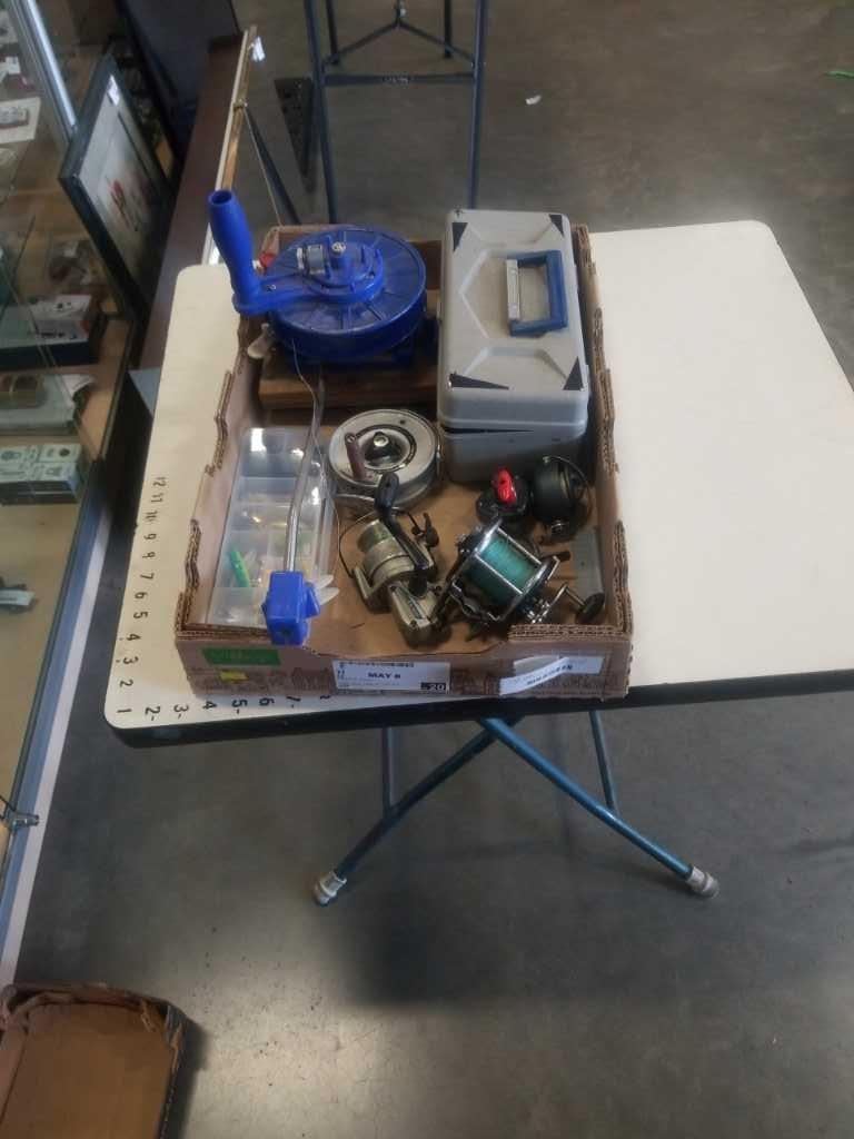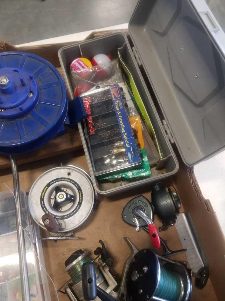 TRAY OF FISHING REELS, TACKLEBOX AND ORGANIZER WITH CONTENTS AND DOWNRIGGER