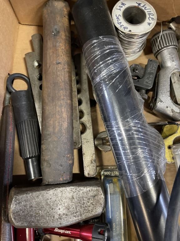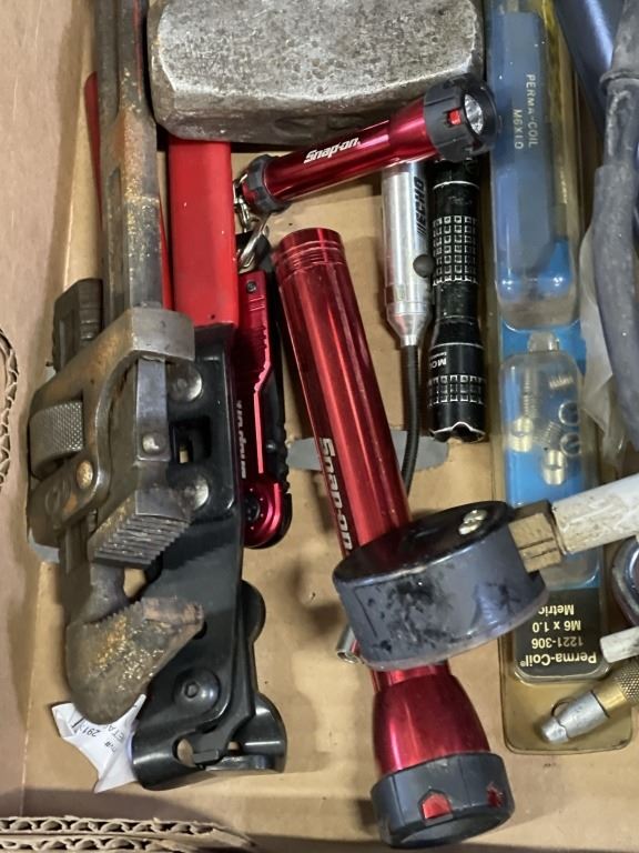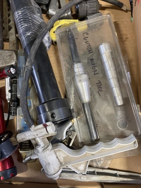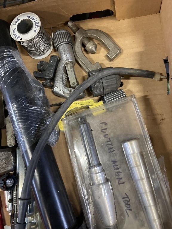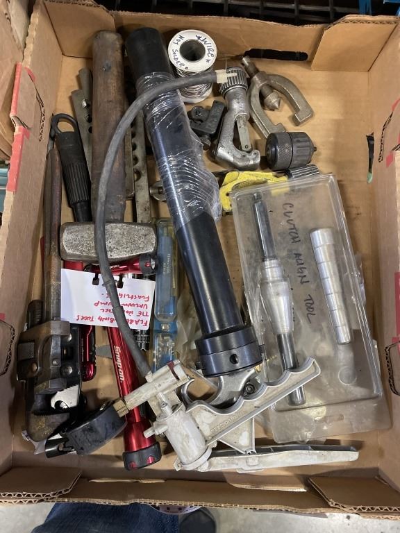 TRAY OF FLARES TUBING TOOLS VACCUM PUMP AND FLASHLIGHTS