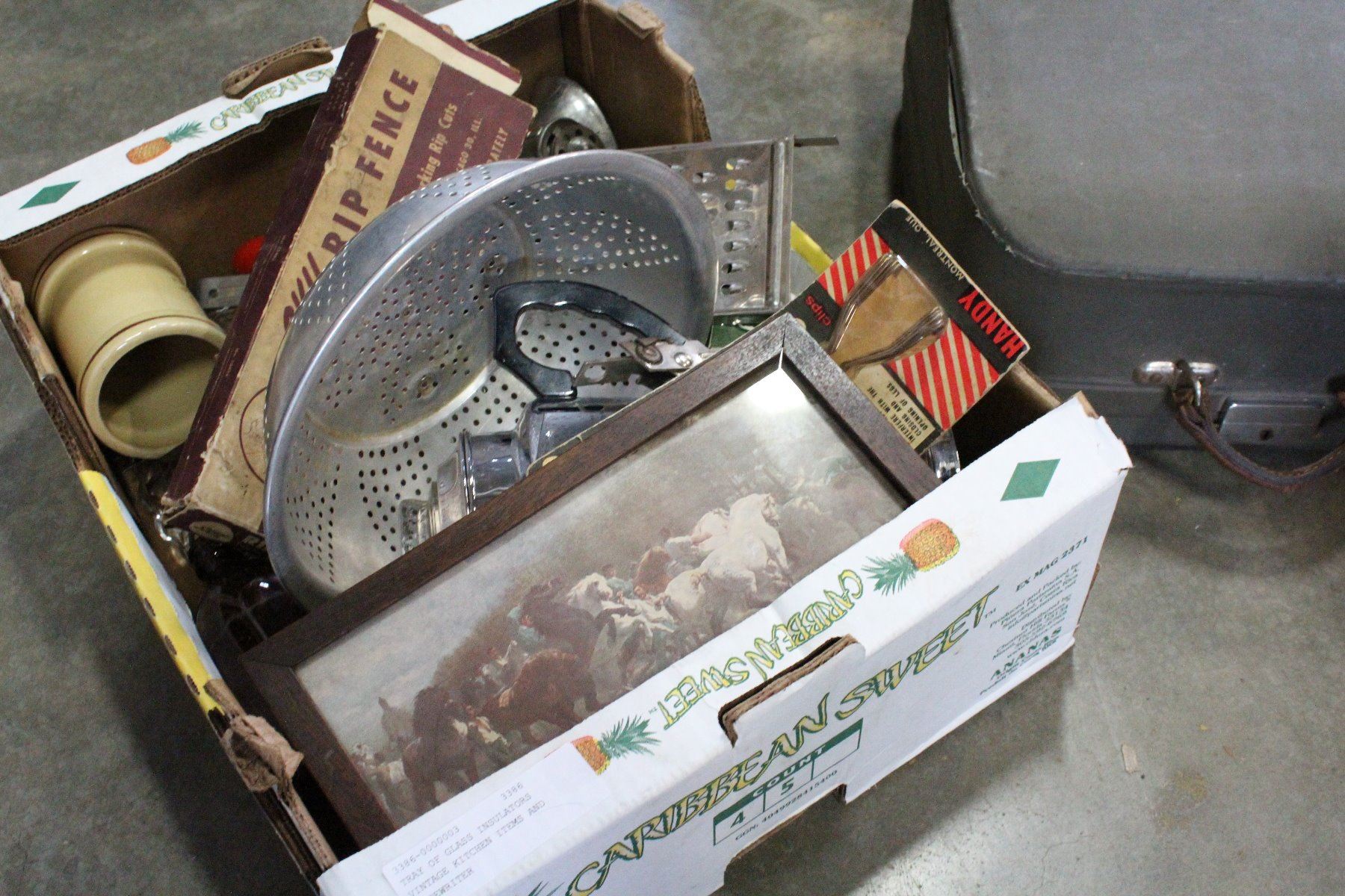 TRAY OF GLASS INSULATORS VINTAGE KITCHEN ITEMS AND TYPEWRITER