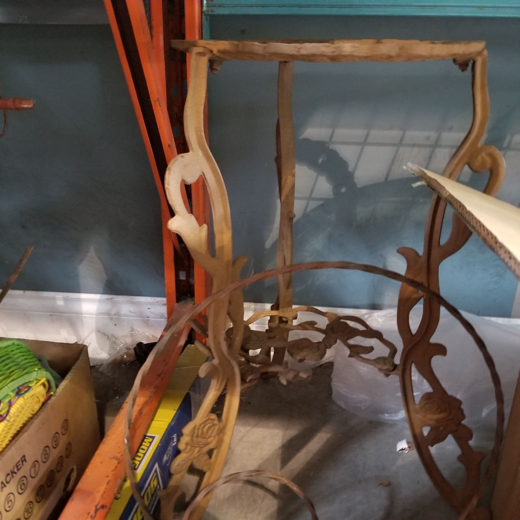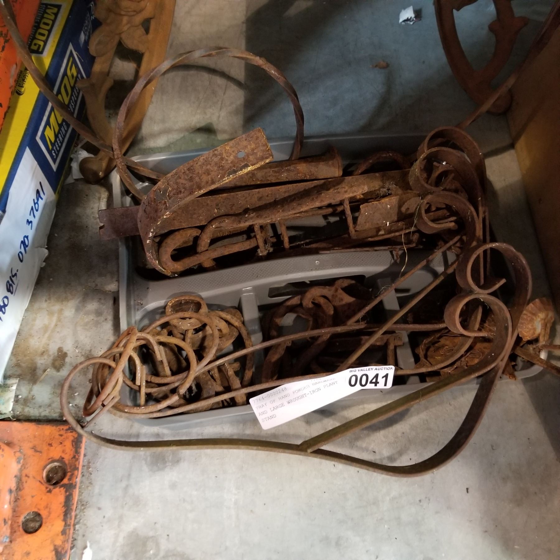 TRAY OF HAND FORGED HARDWARE AND LARGE WROUGHT-IRON PLANT STAND