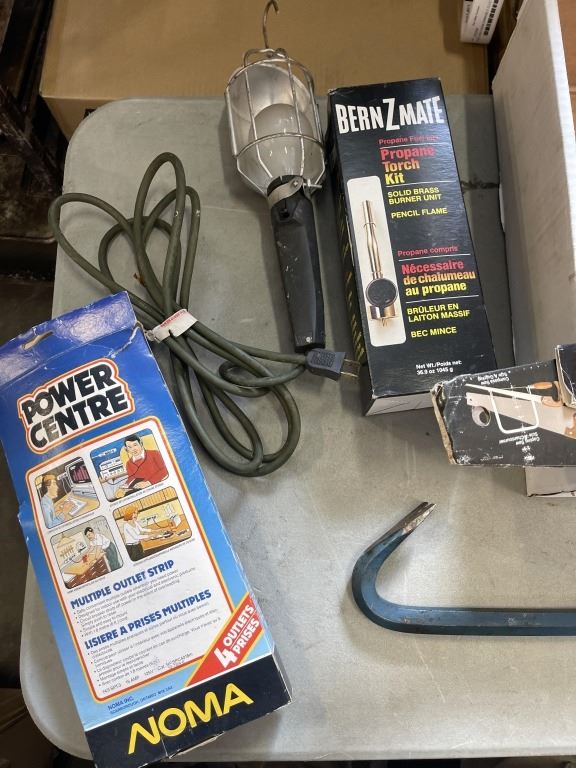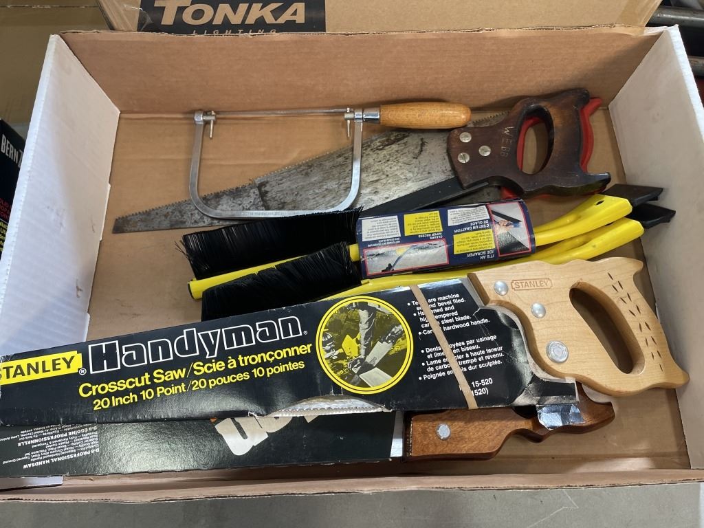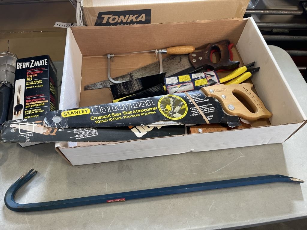 TRAY OF HAND SAWS, TORCH, CROW BAR ETC