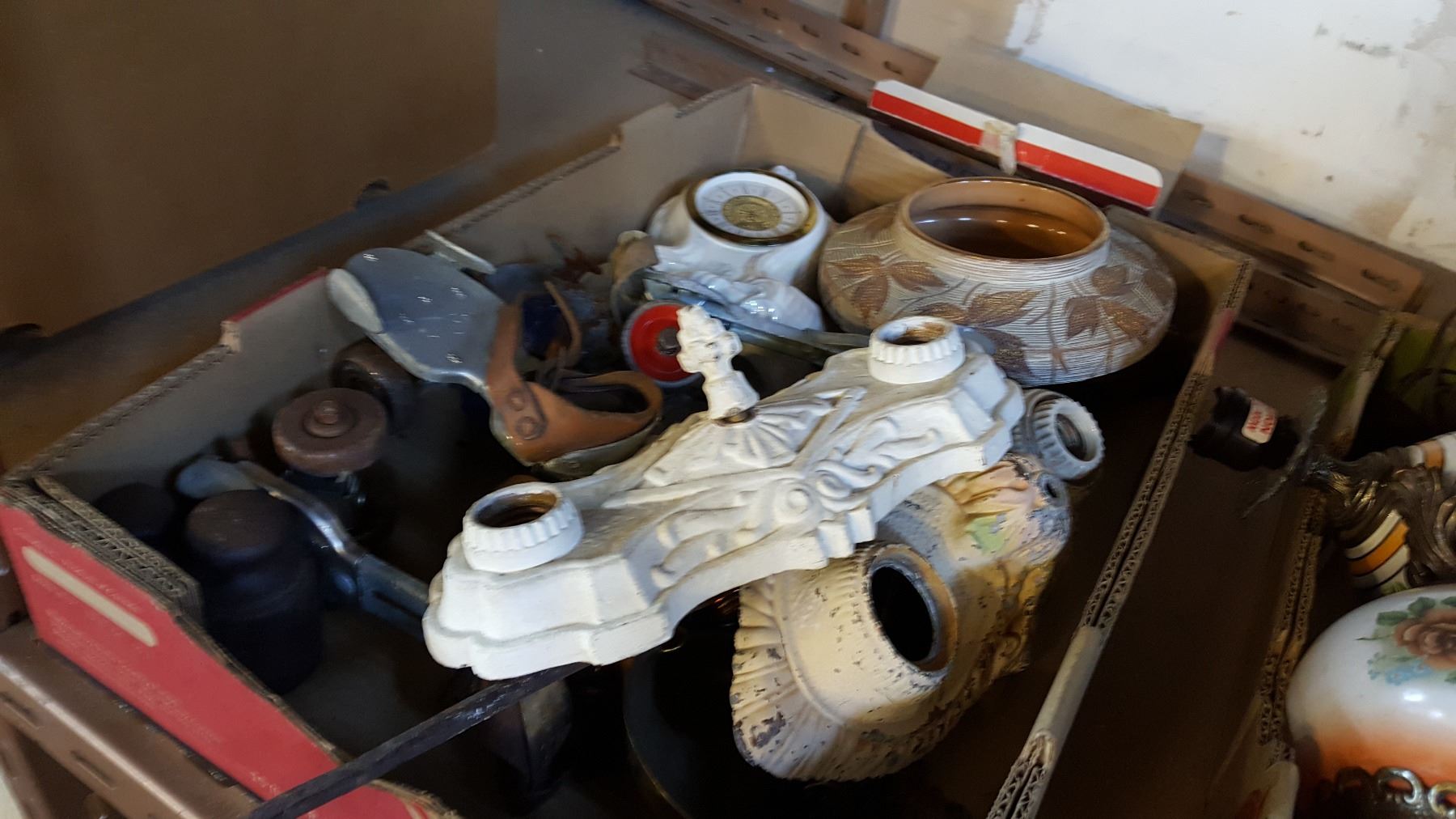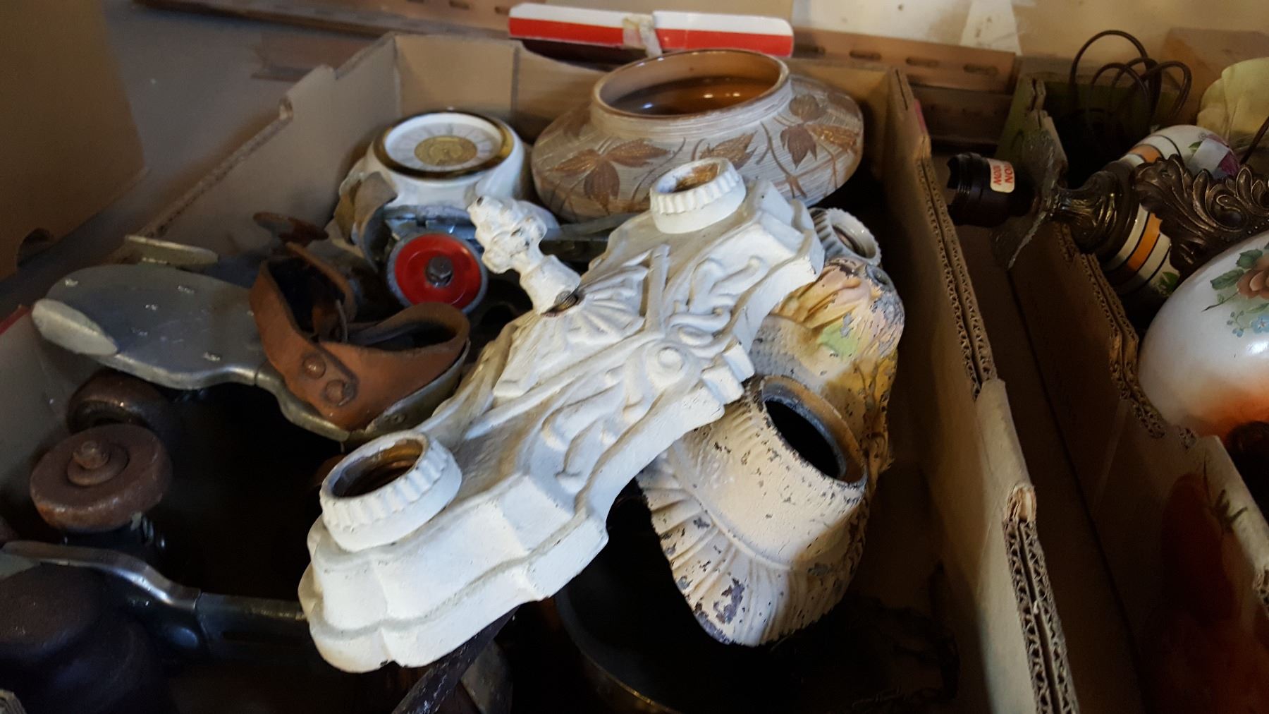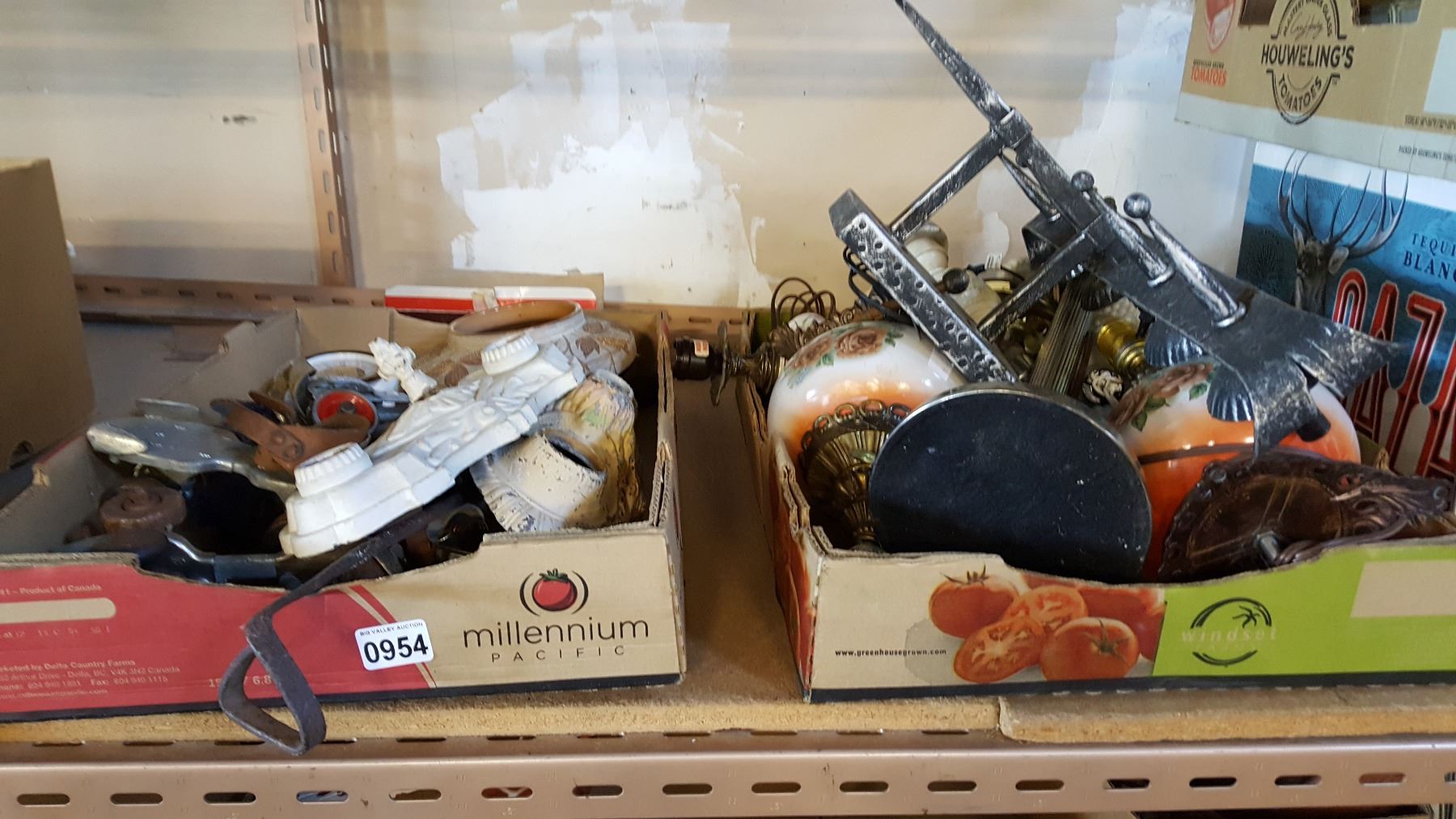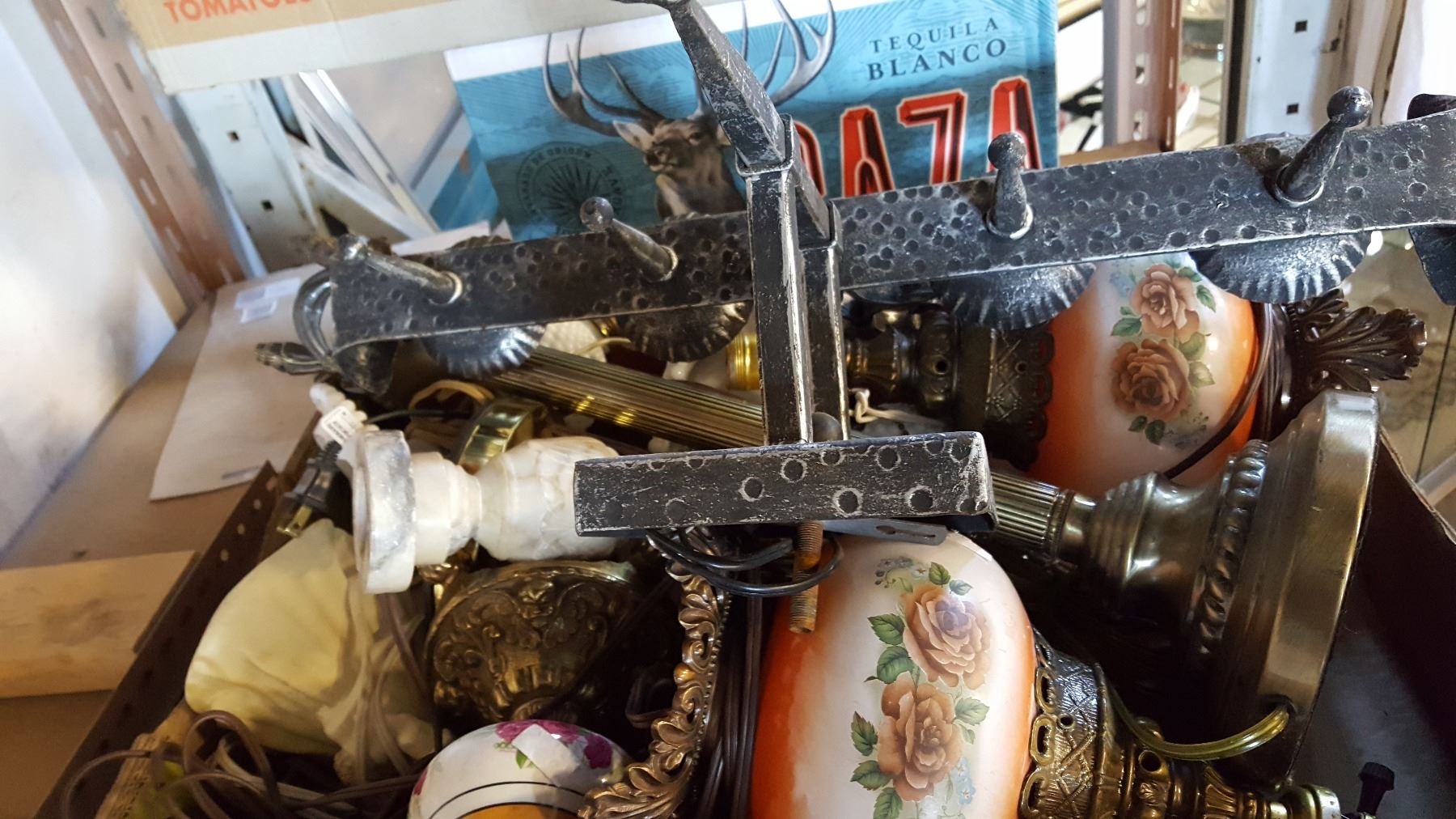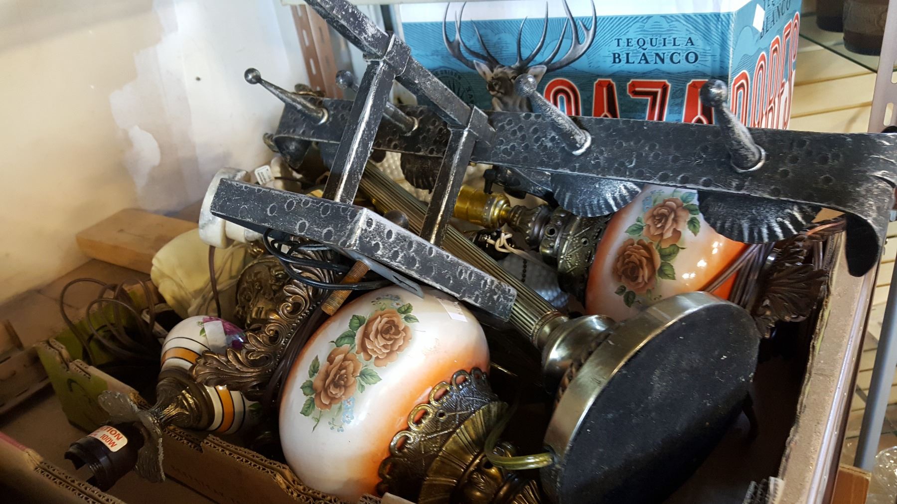 TRAY OF HOBNAIL AND OTHER LAMPS, AND TRAY OF METAL SKATES DOCKS