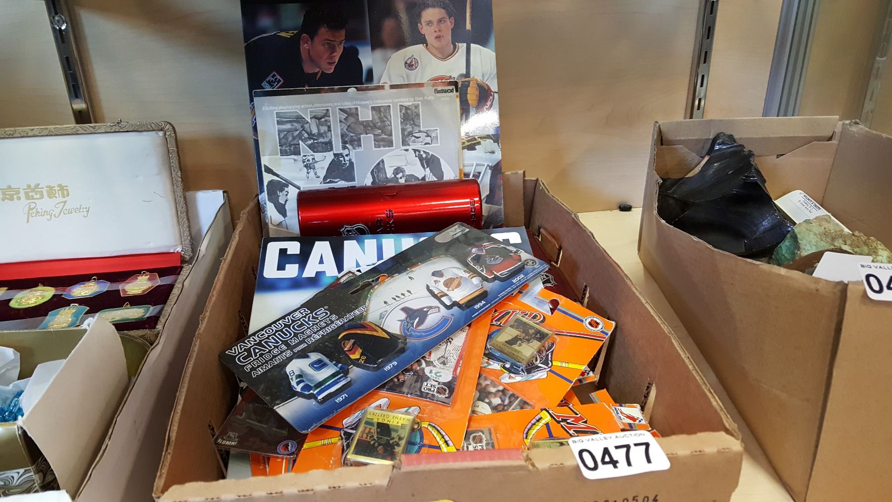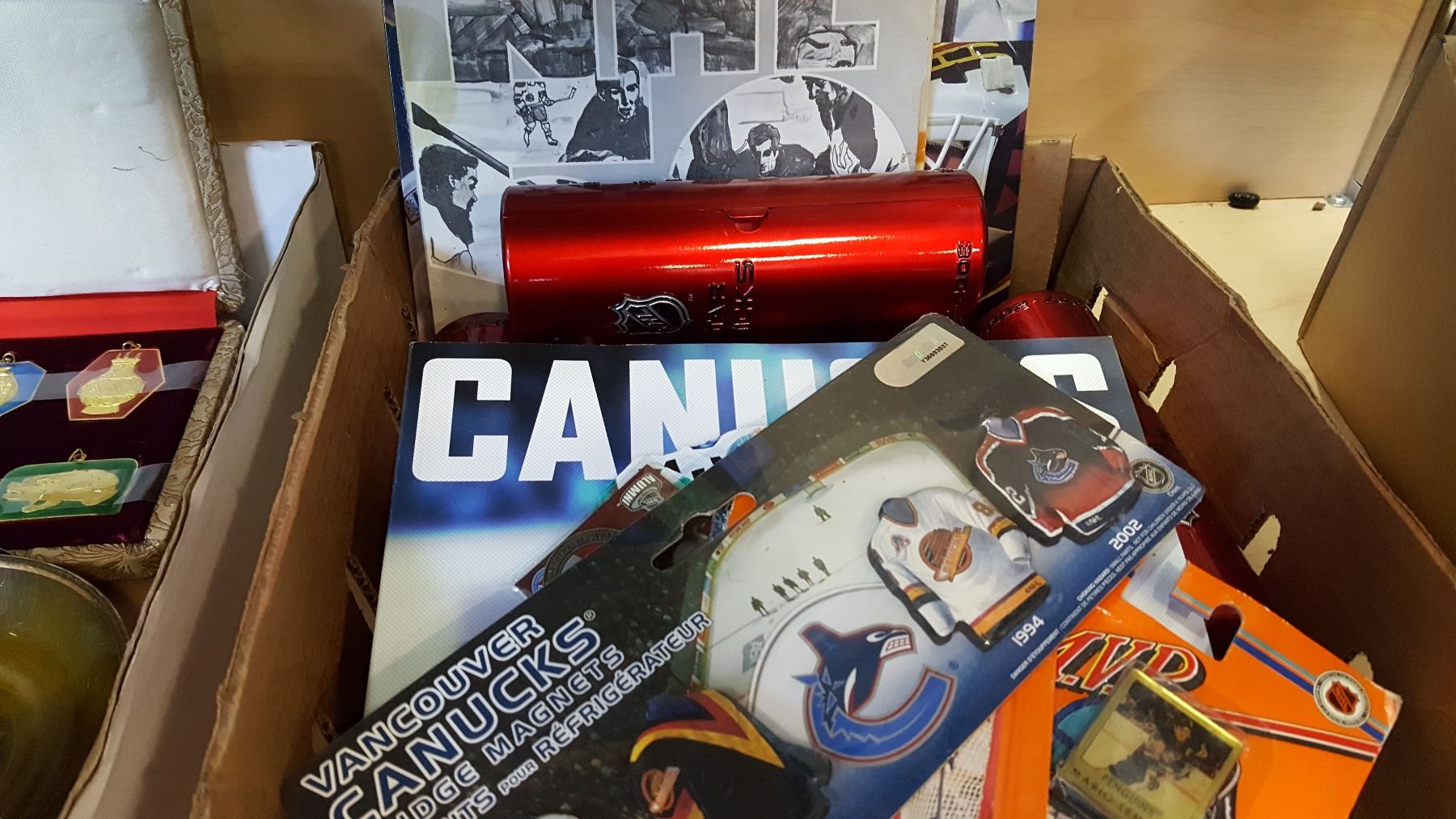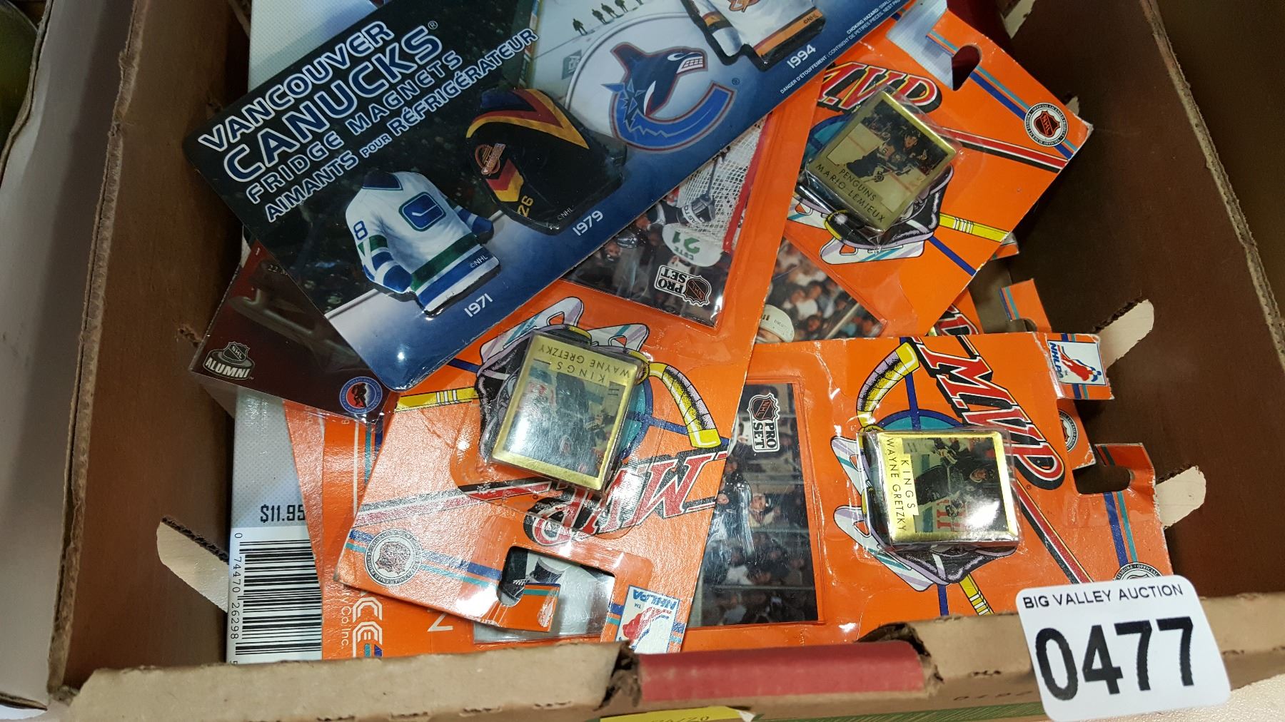 TRAY OF HOCKEY COLLECTIBLE AND MINI MCDONALDS HOCKEY STICKS