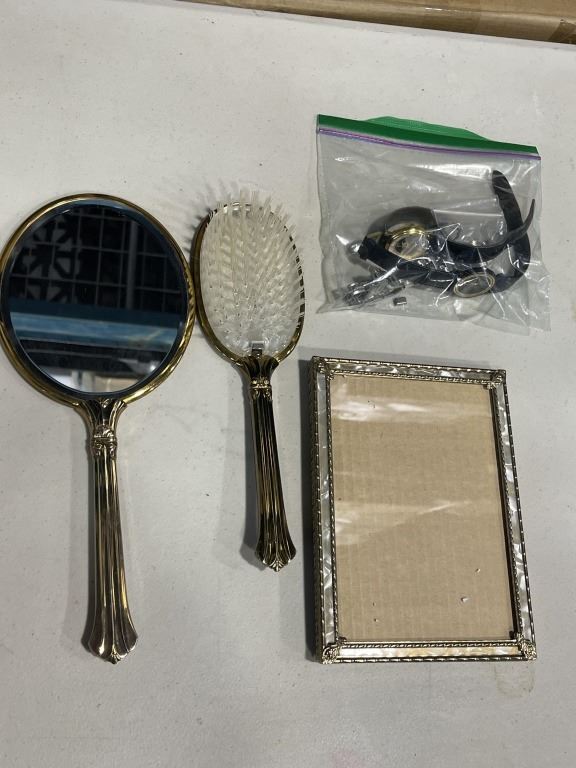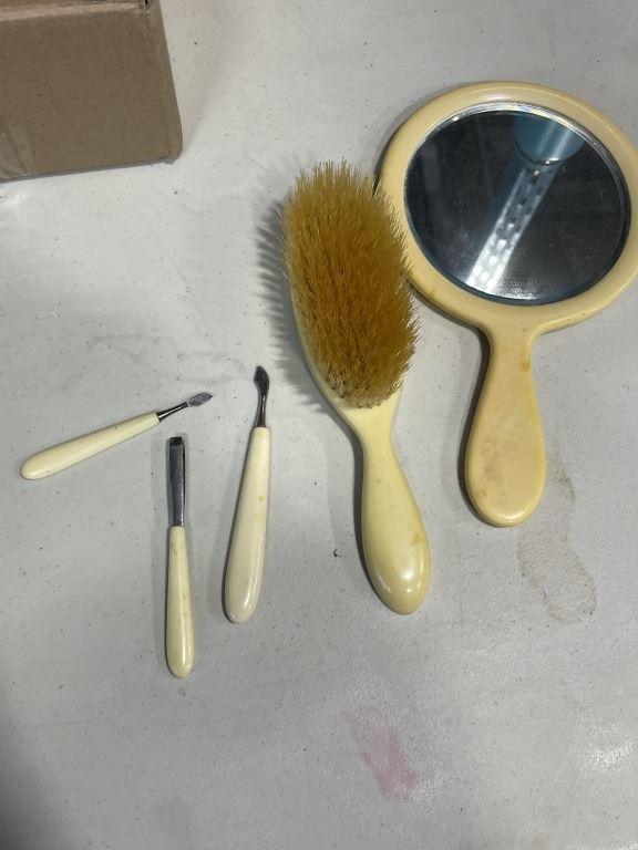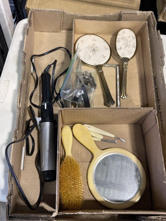 TRAY OF HOUSEHOLD ITEMS INCLUDING CURLING IRON AND VANITY SETS