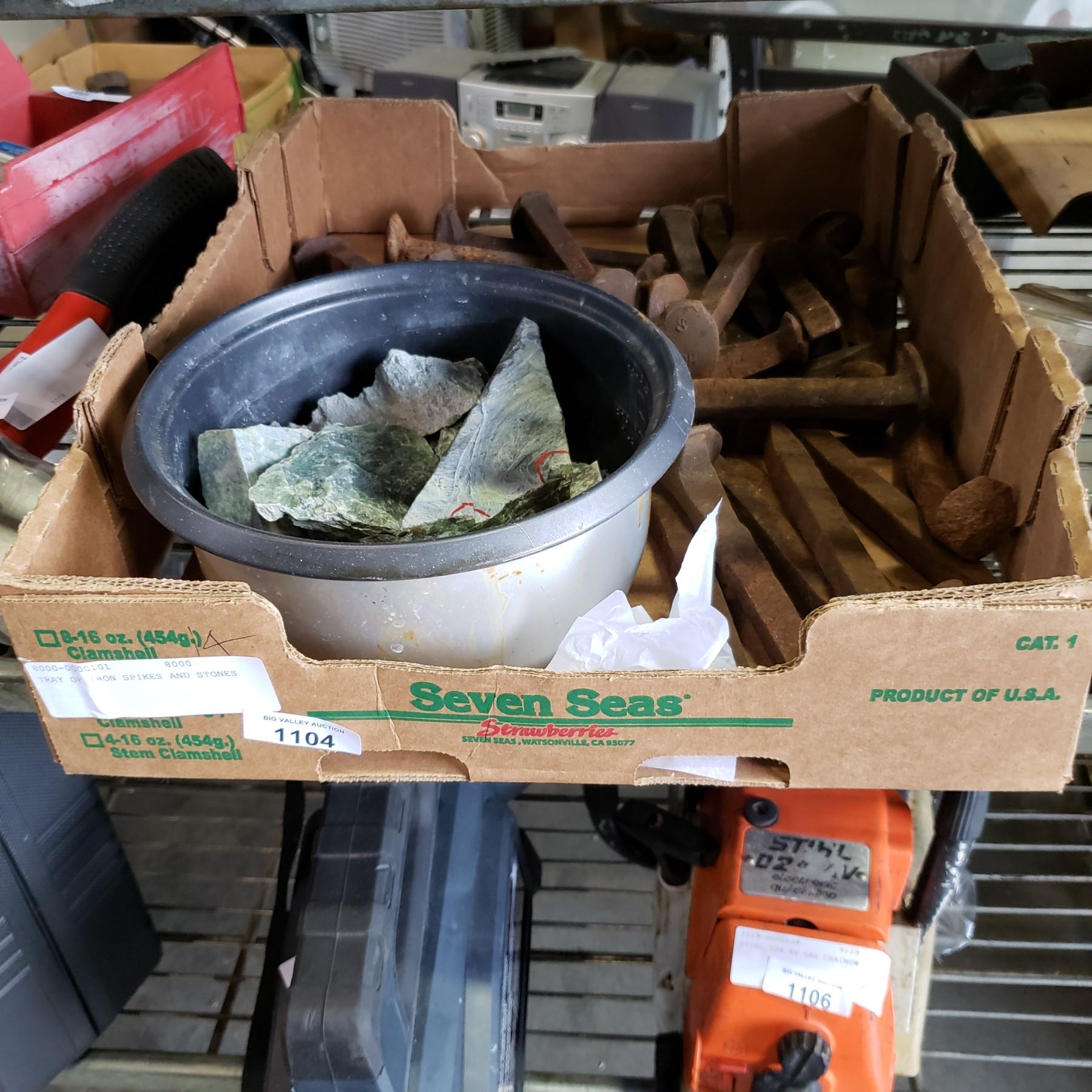 TRAY OF IRON SPIKES AND STONES