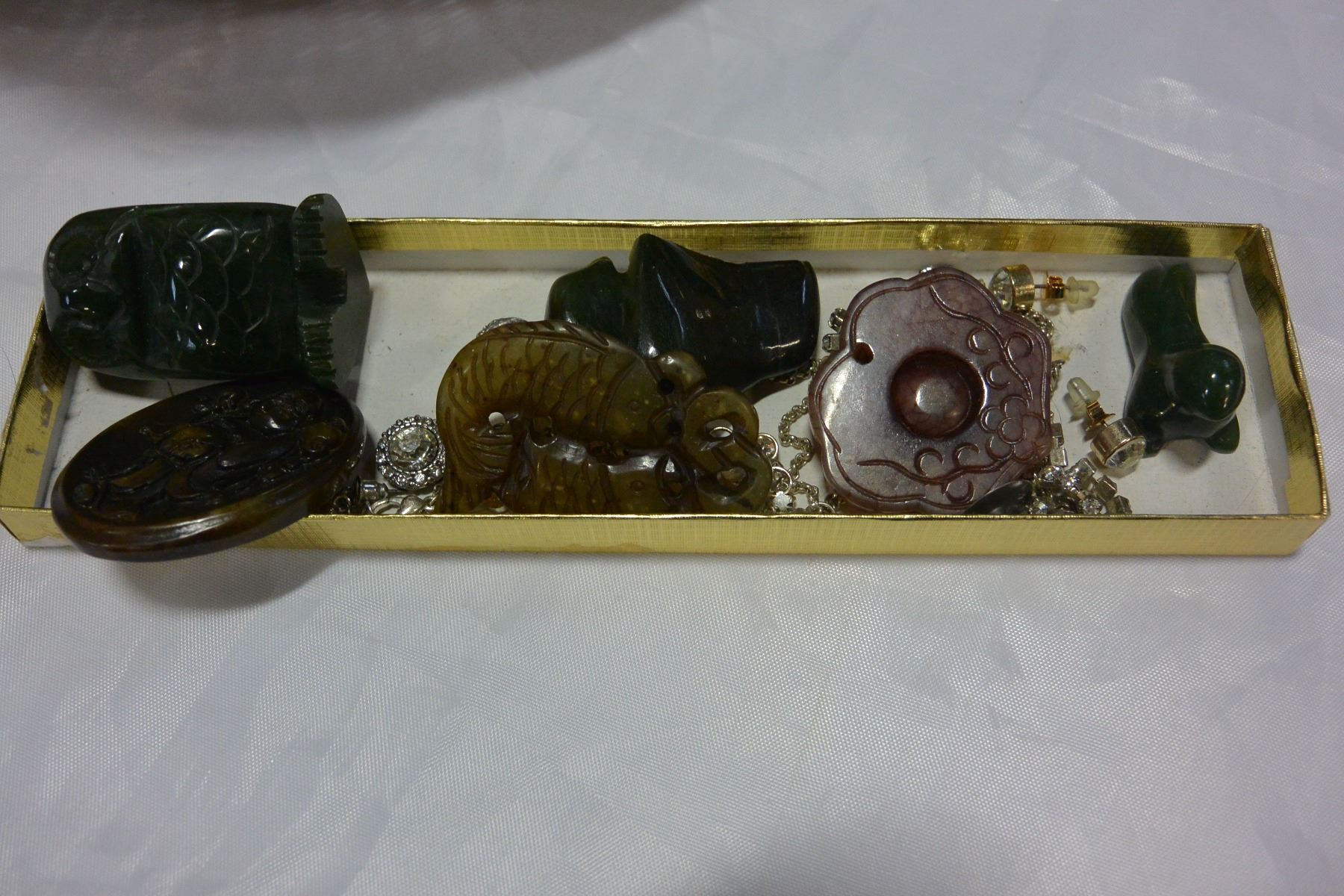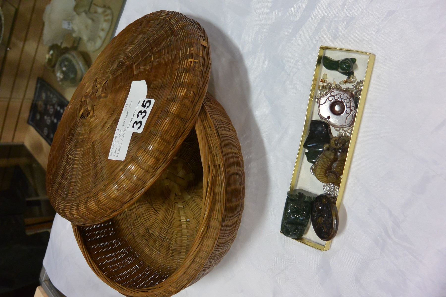 TRAY OF JADE JEWELLRY AND WICKER BASKET