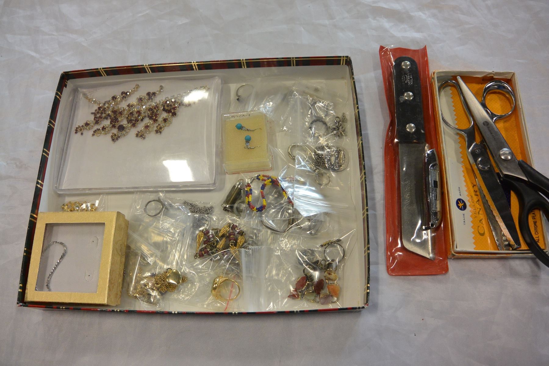 TRAY OF JEWELLRY AND VINTAGE SCISSORS