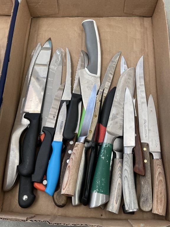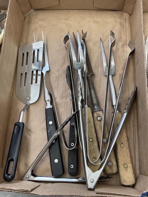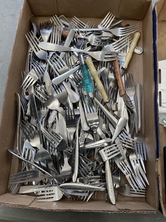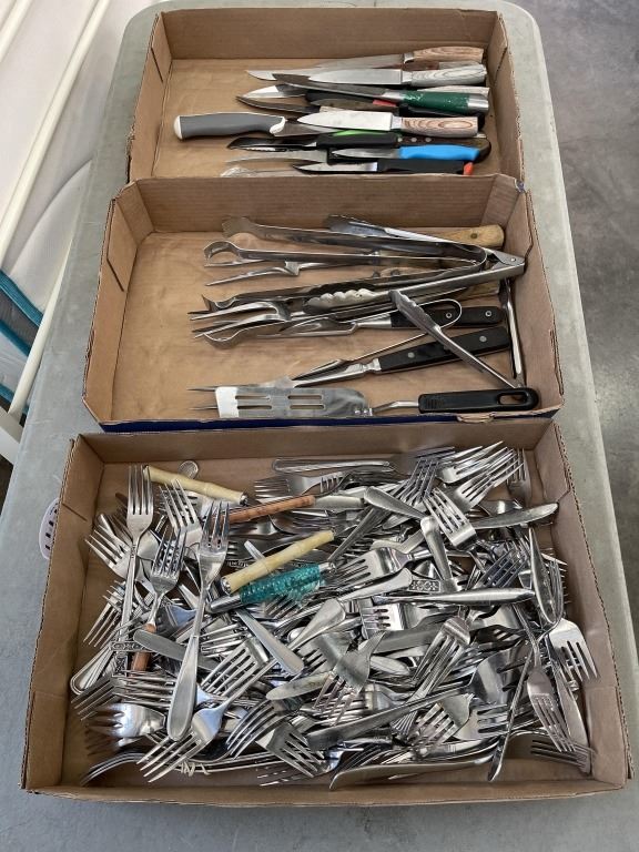 TRAY OF KNIVES, FORKS, AND SERVING UTENSILS