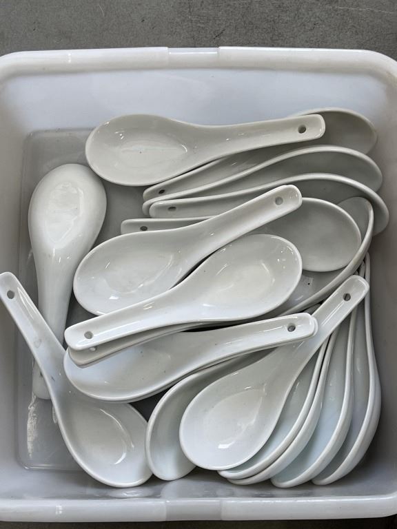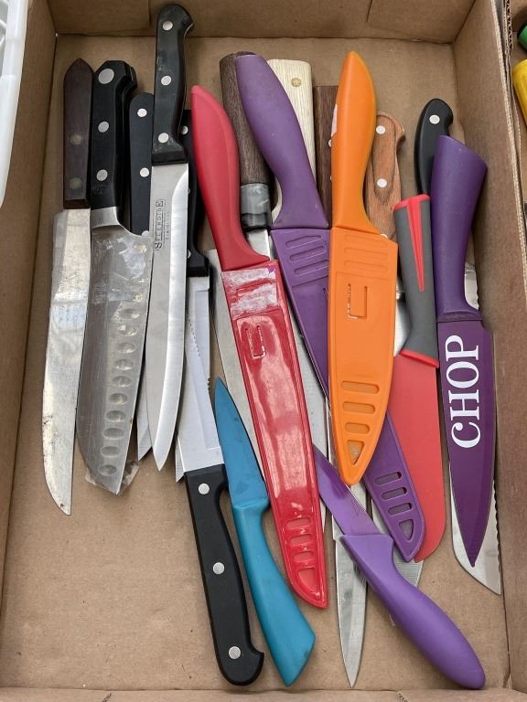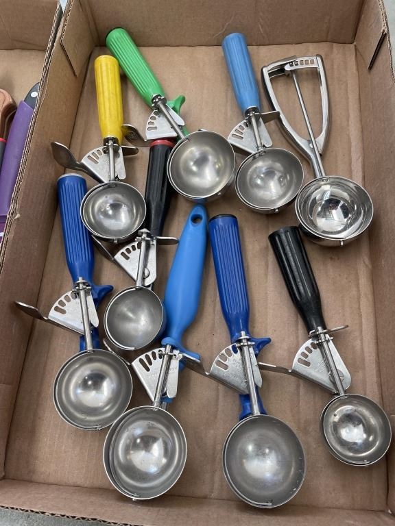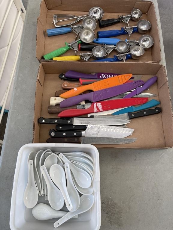 TRAY OF KNIVES, SERVING SPOONS, AND BAKING SCOOPS