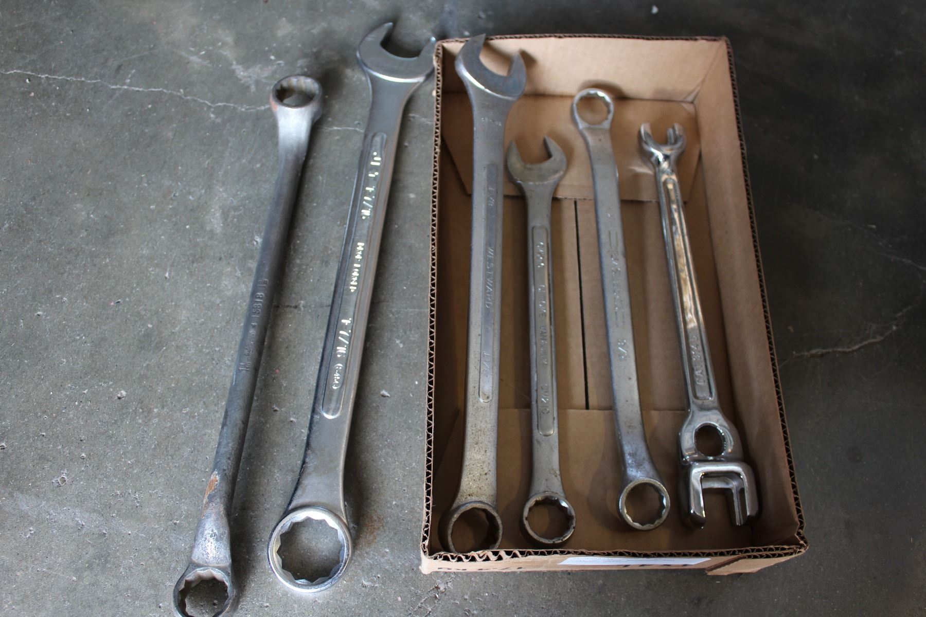 TRAY OF LARGE WRENCHES AND LINEMANS WRENCH