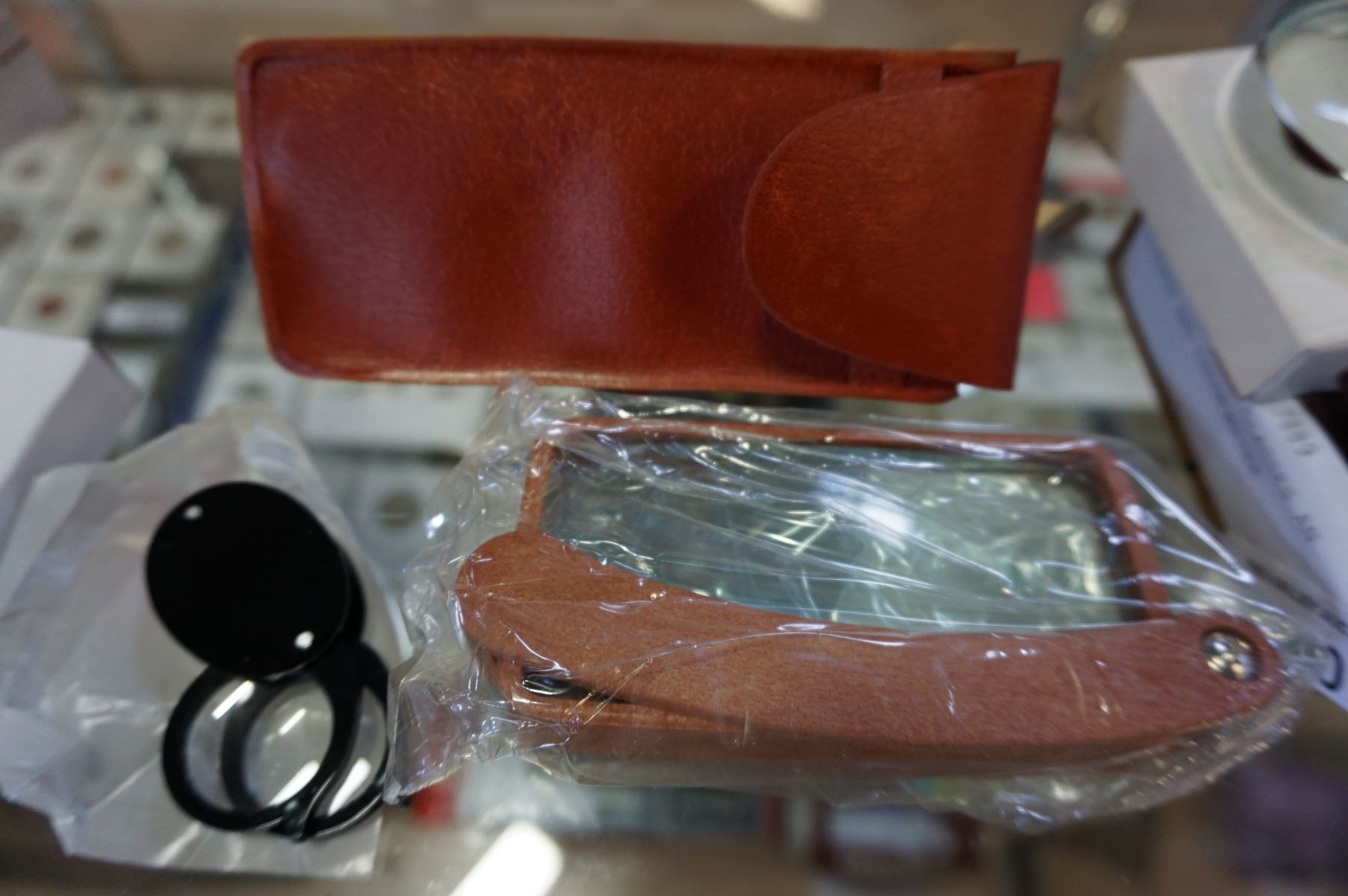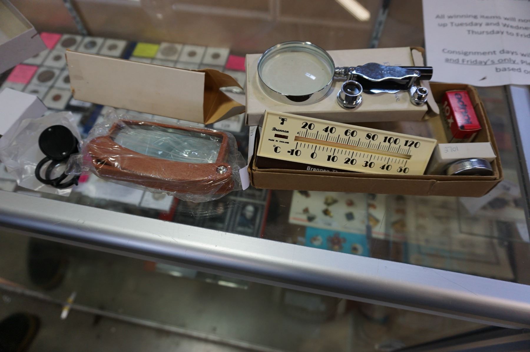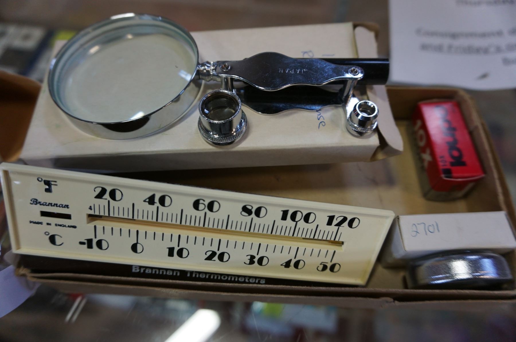 TRAY OF MAGNIFYING GLASSES AN DLOUPES AND THERMOMETER