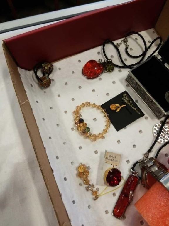 TRAY OF MAN MADE AMBER JEWELRY, WATCHES AND JEWELRY