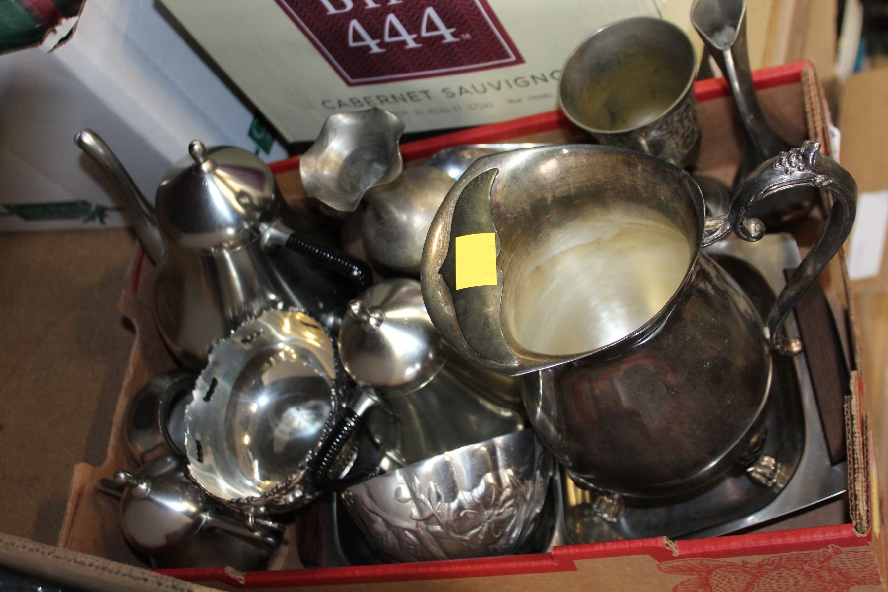 TRAY OF METAL SERVING PIECES COFFEE POT AND PITCHER