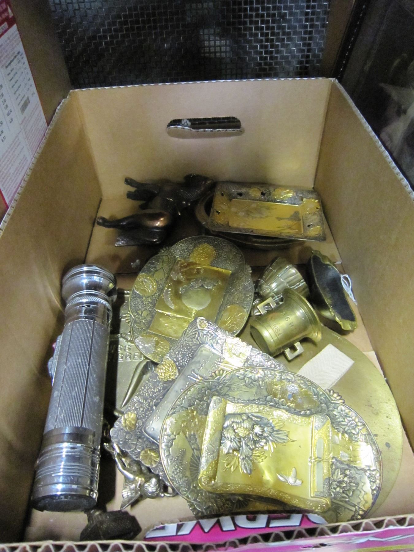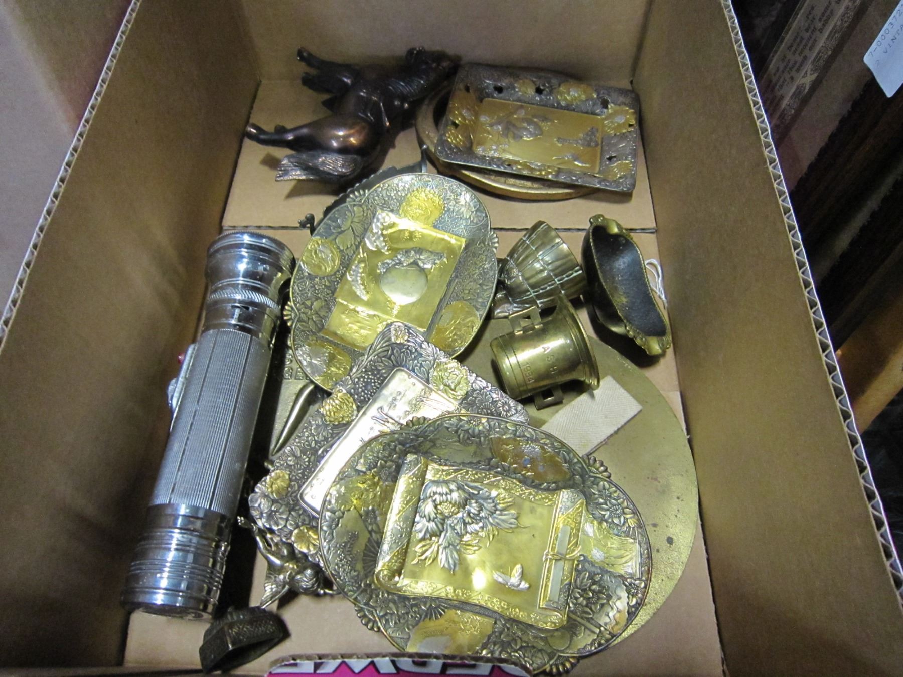 TRAY OF METAL TRAYS, FIGURES, AND FLASH LIGHT