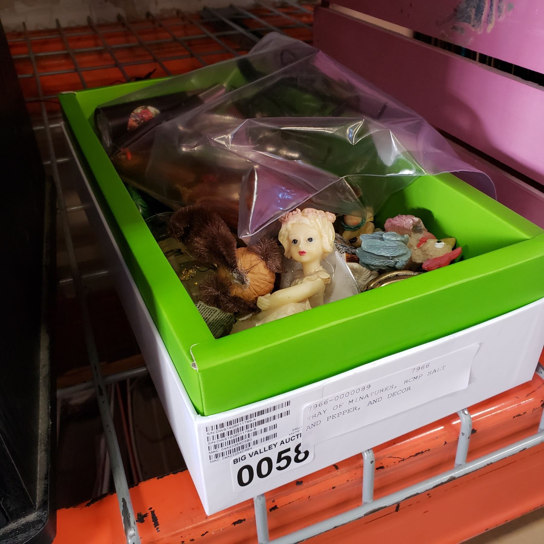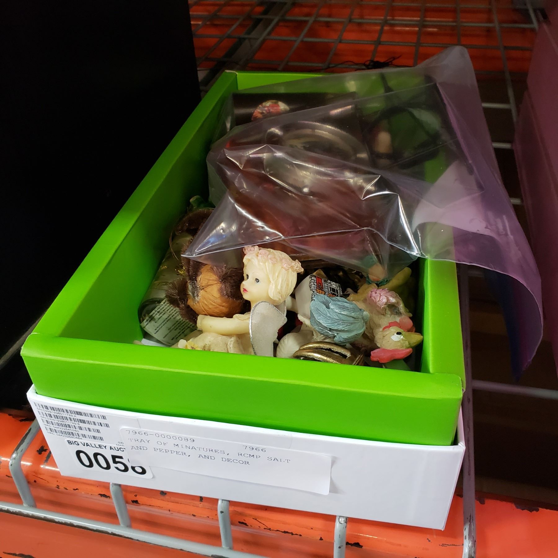 TRAY OF MINATURES, RCMP SALT AND PEPPER, AND DECOR