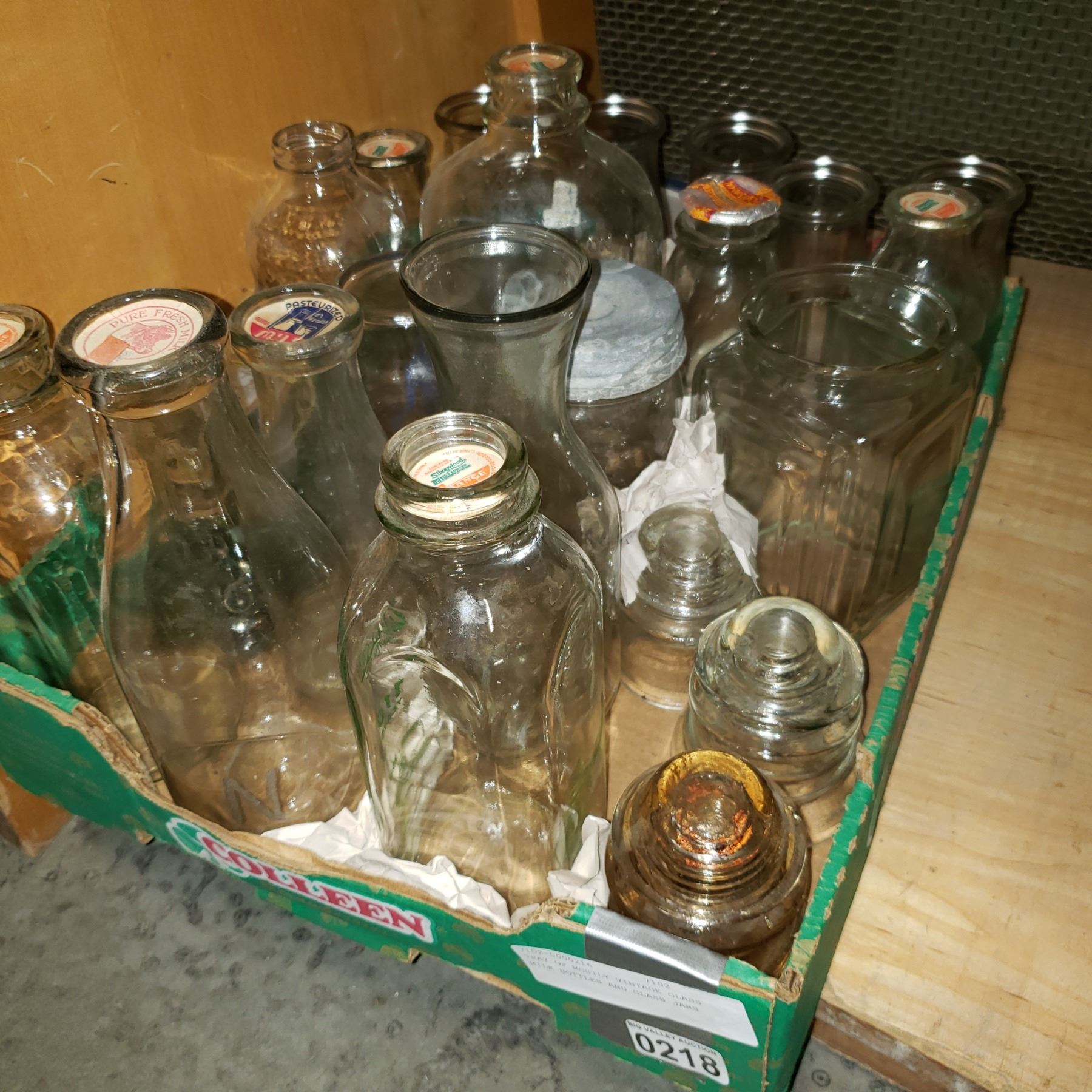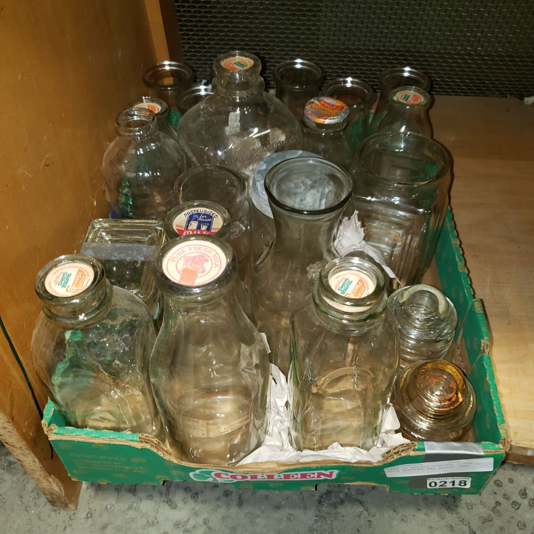 TRAY OF MOSTLY VINTAGE GLASS MILK BOTTLES AND GLASS JARS