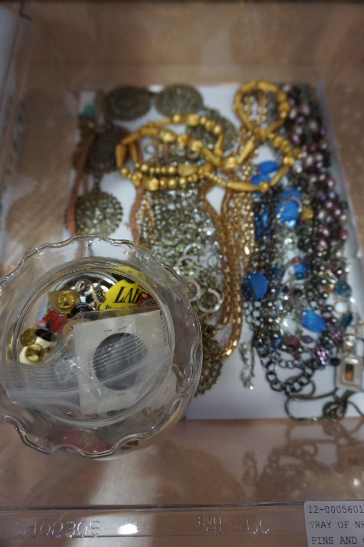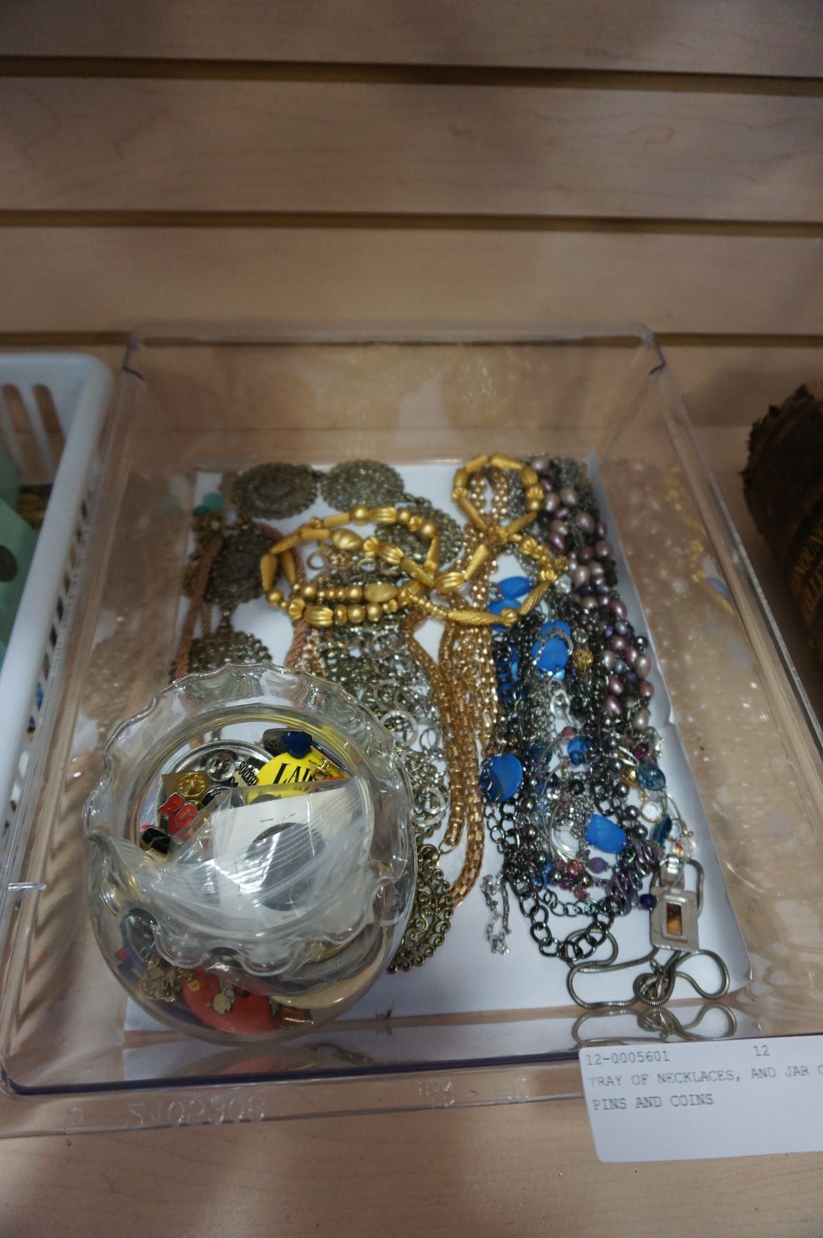 TRAY OF NECKLACES, AND JAR OF PINS AND COINS