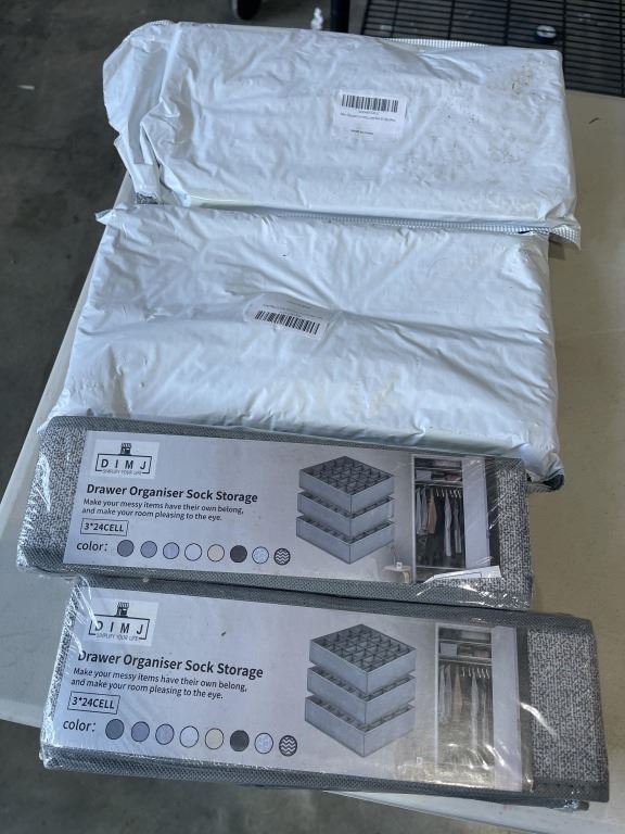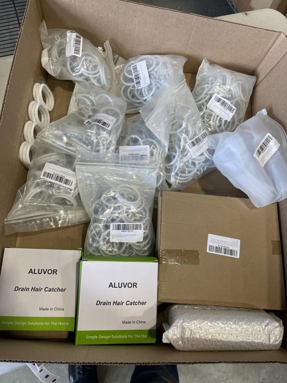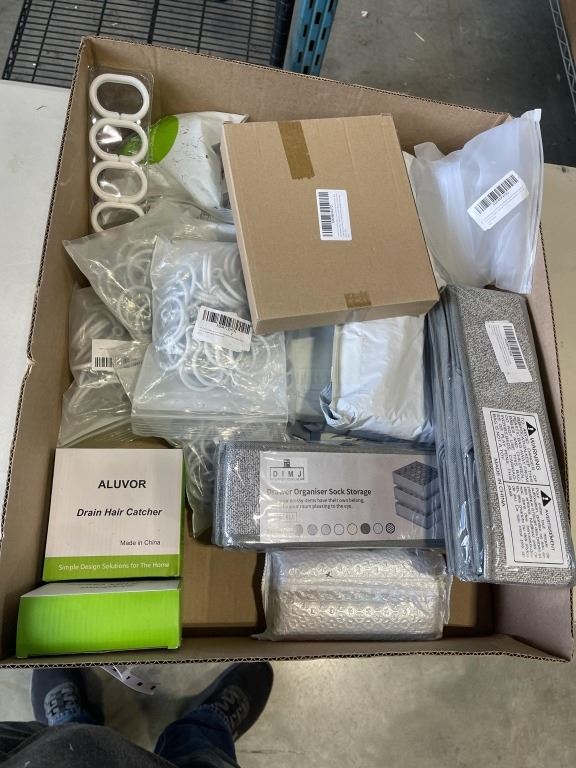 TRAY OF NEW AMAZON ITEMS - CLOSET ORGANIZERS, CURTAIN RINGS, ETC