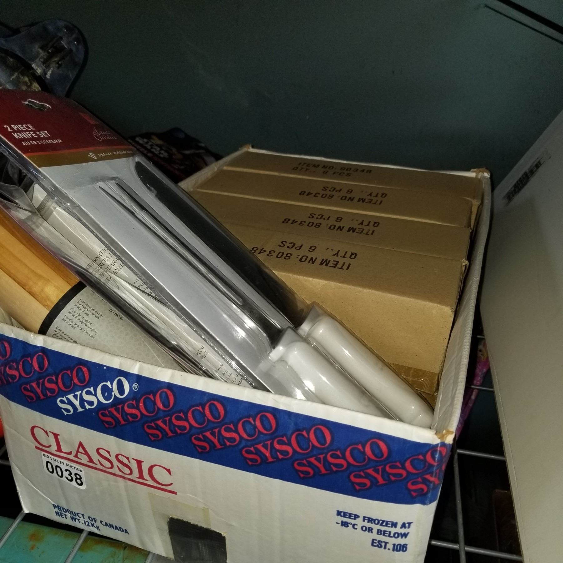 TRAY OF NEW CARVING KNIVES, BREAD KNIVES, AND WHISKS