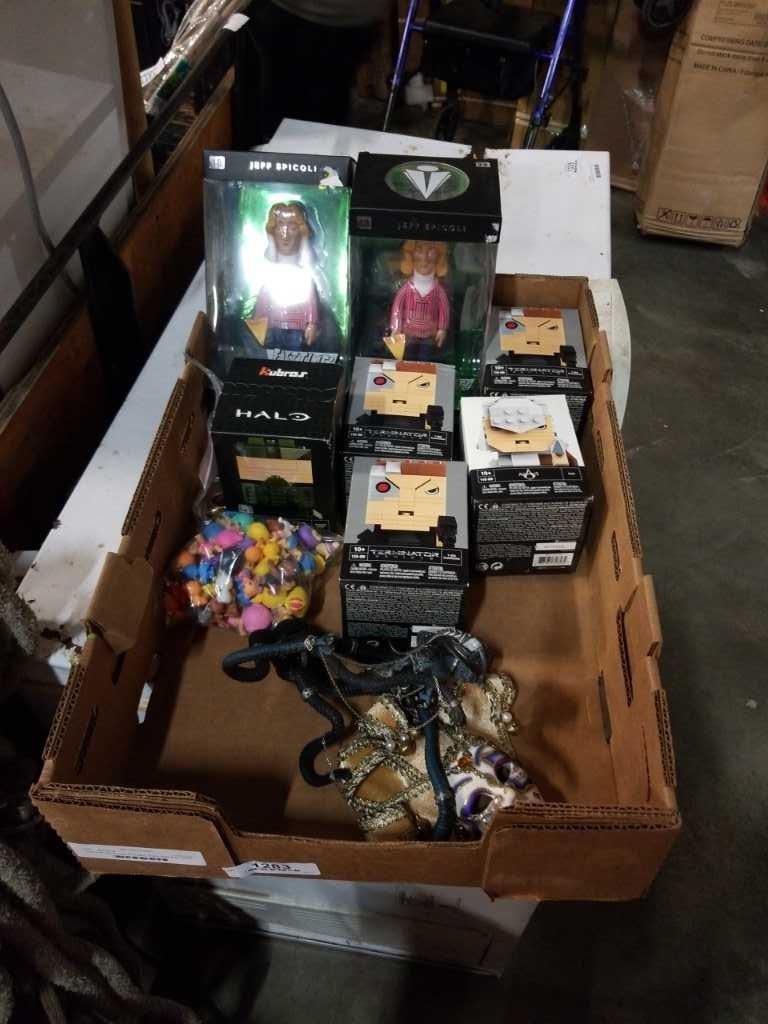 TRAY OF NEW COLLECTIBLE TOYS AND 4 SETS OF NEW DISHCLOTHS