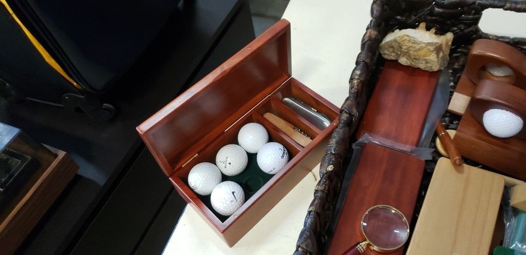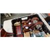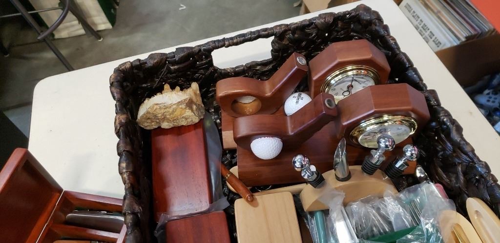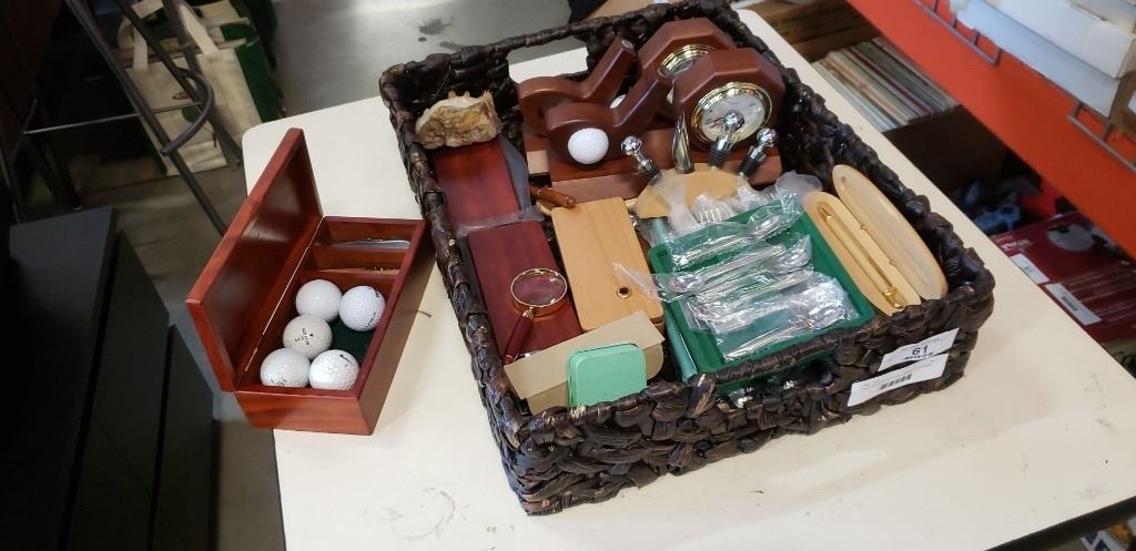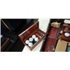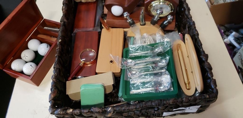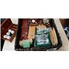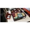 TRAY OF NEW CUTLERY, WINE STOPPERS, DISPLAY CASE, ETC
