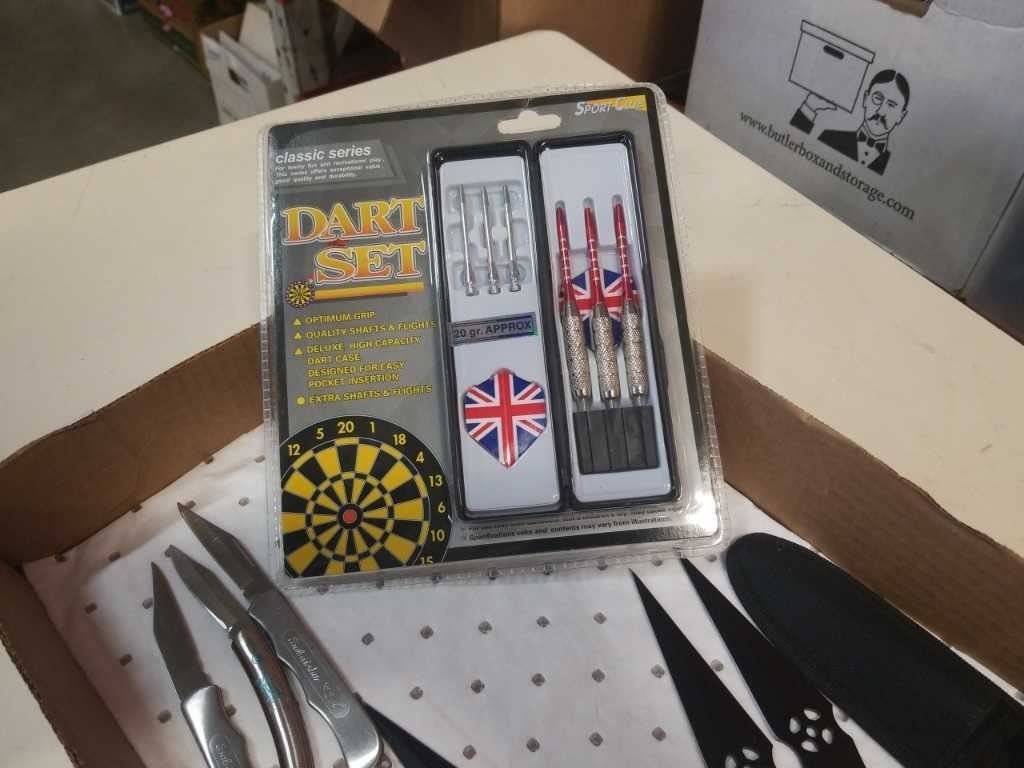 TRAY OF NEW KNIVES AND DARTS - COLUMBIA MECHANICAL FOLDING KNIFE, THROWING KNIVES, FOLDING KNIVES