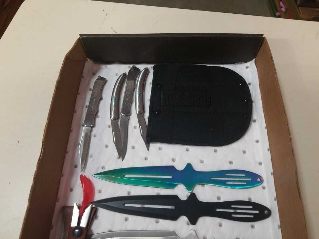 TRAY OF NEW KNIVES AND DARTS - THROWING KNIVES, FOLDING KNIVES
