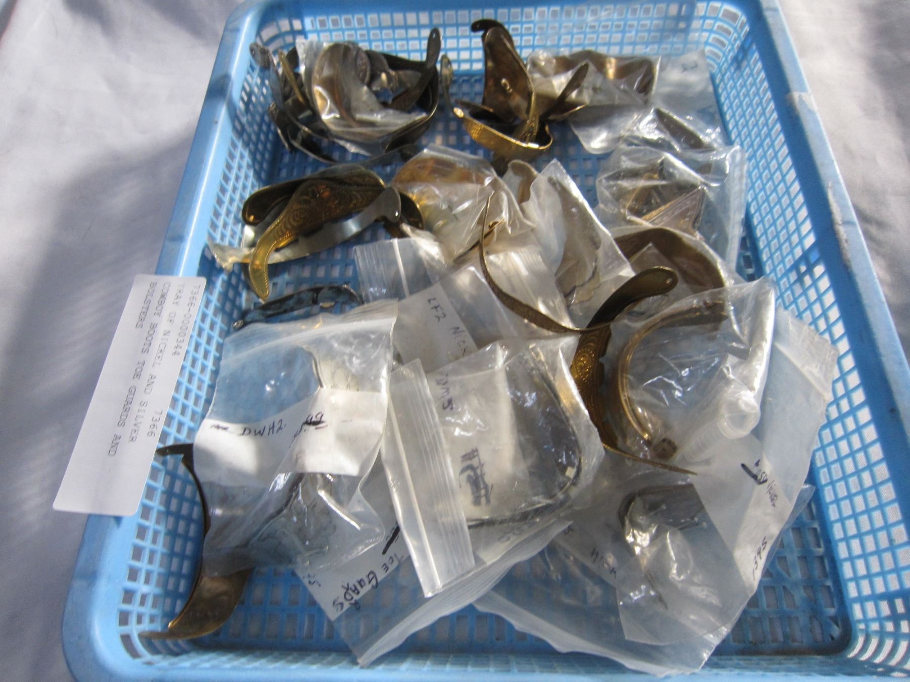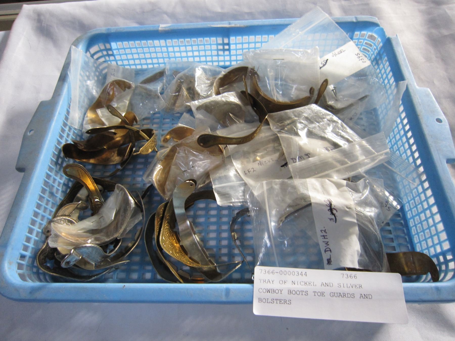 TRAY OF NICKEL AND SILVER COWBOY BOOTS TOE GUARDS AND BOLSTERS