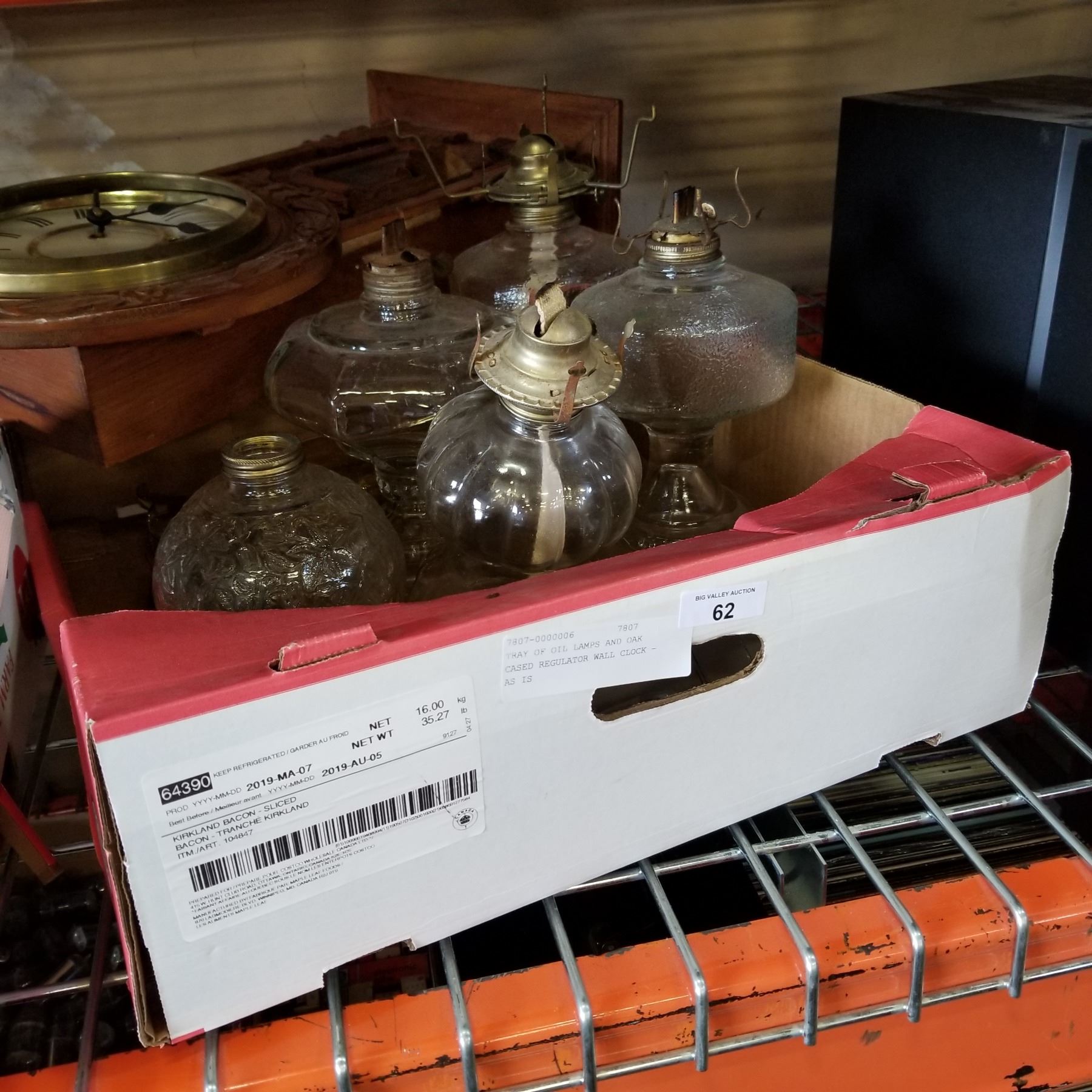 TRAY OF OIL LAMPS AND OAK CASED REGULATOR WALL CLOCK - AS IS