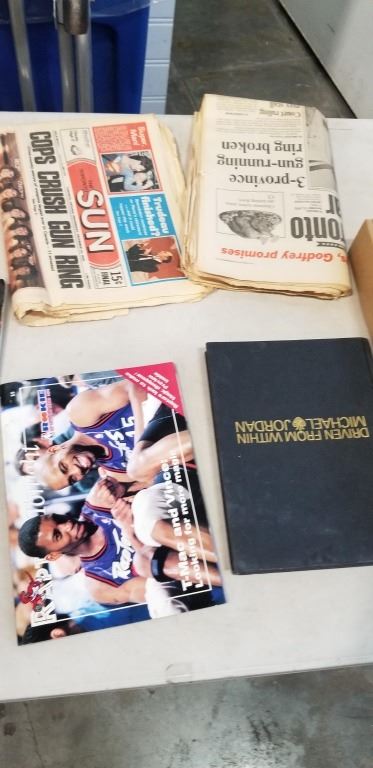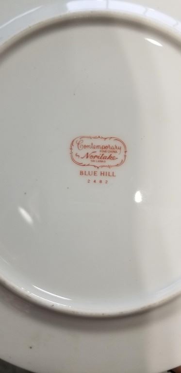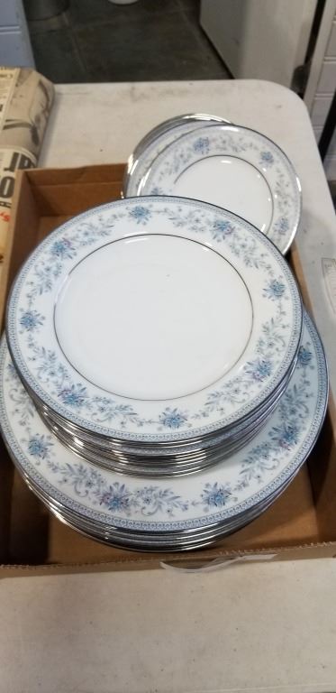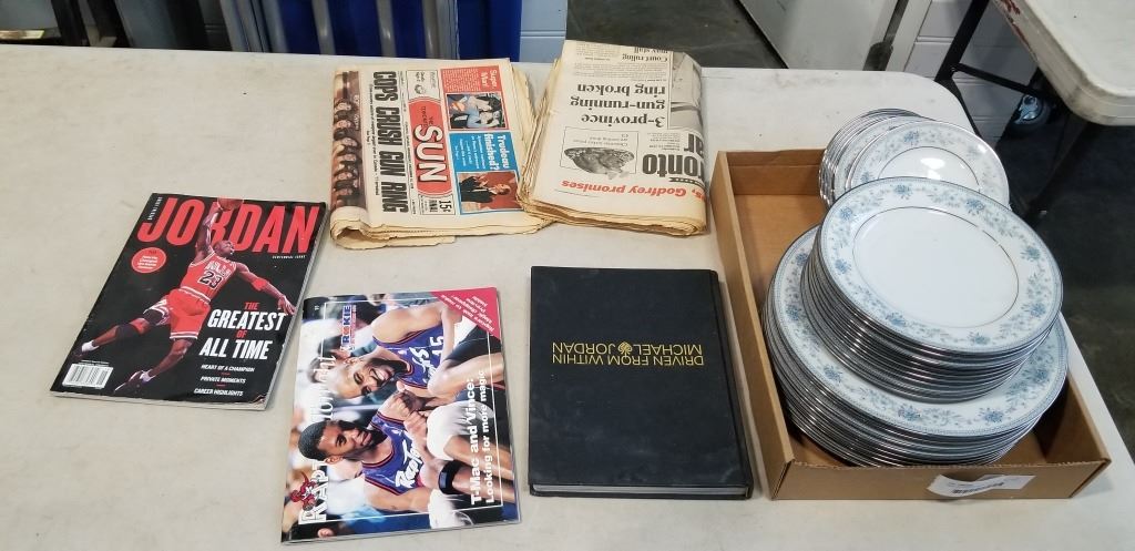 TRAY OF PLATES NORITAKE BLUE HILL AND VINTAGE NEWPAPER AND BOOKS