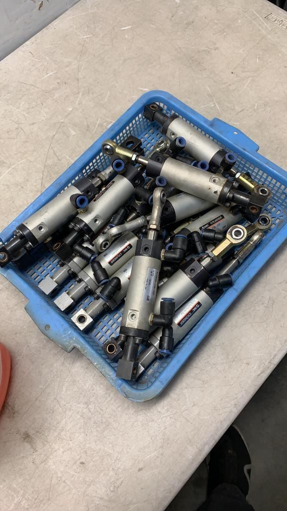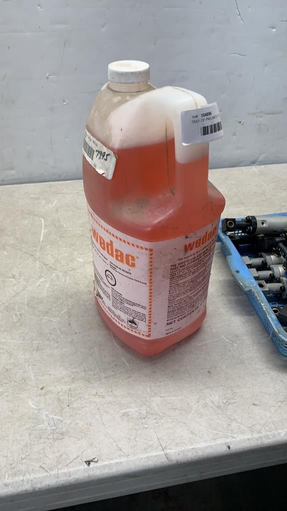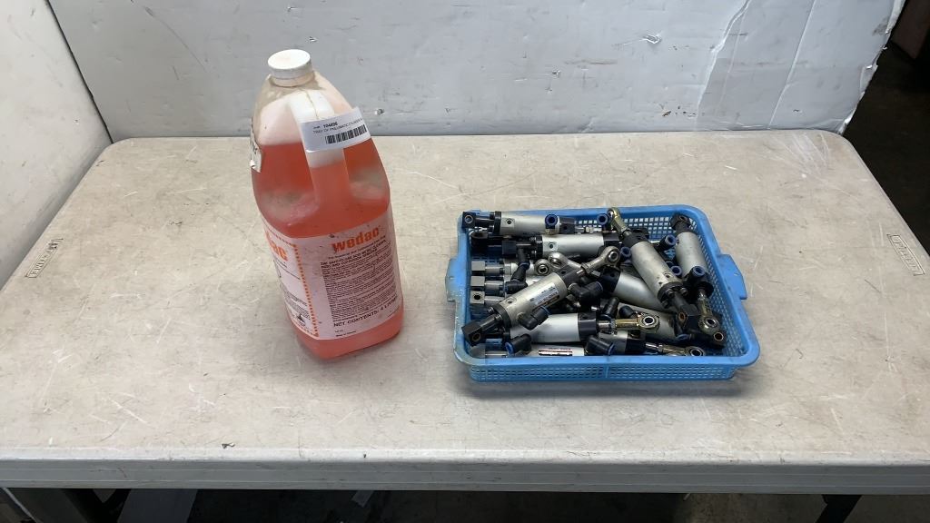 TRAY OF PNEUMATIC CYLINDERS AND JUG OF WEDAC ACID METAL CLEANER