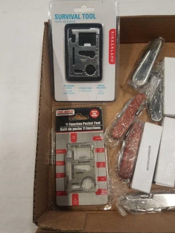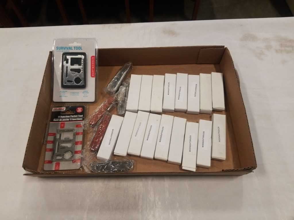 TRAY OF POCKET KNIVES AND SURVIVAL TOOLS