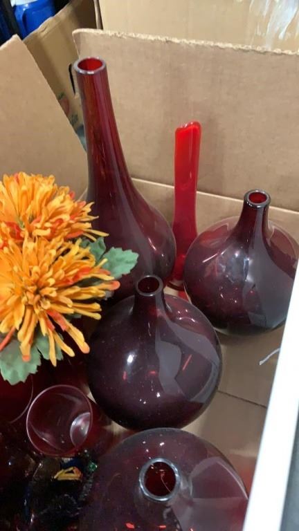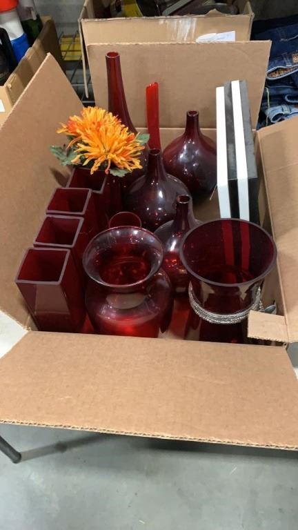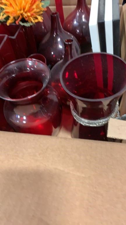 TRAY OF RED GLASS VASES AND BLACK AND WHITE MIRRORS