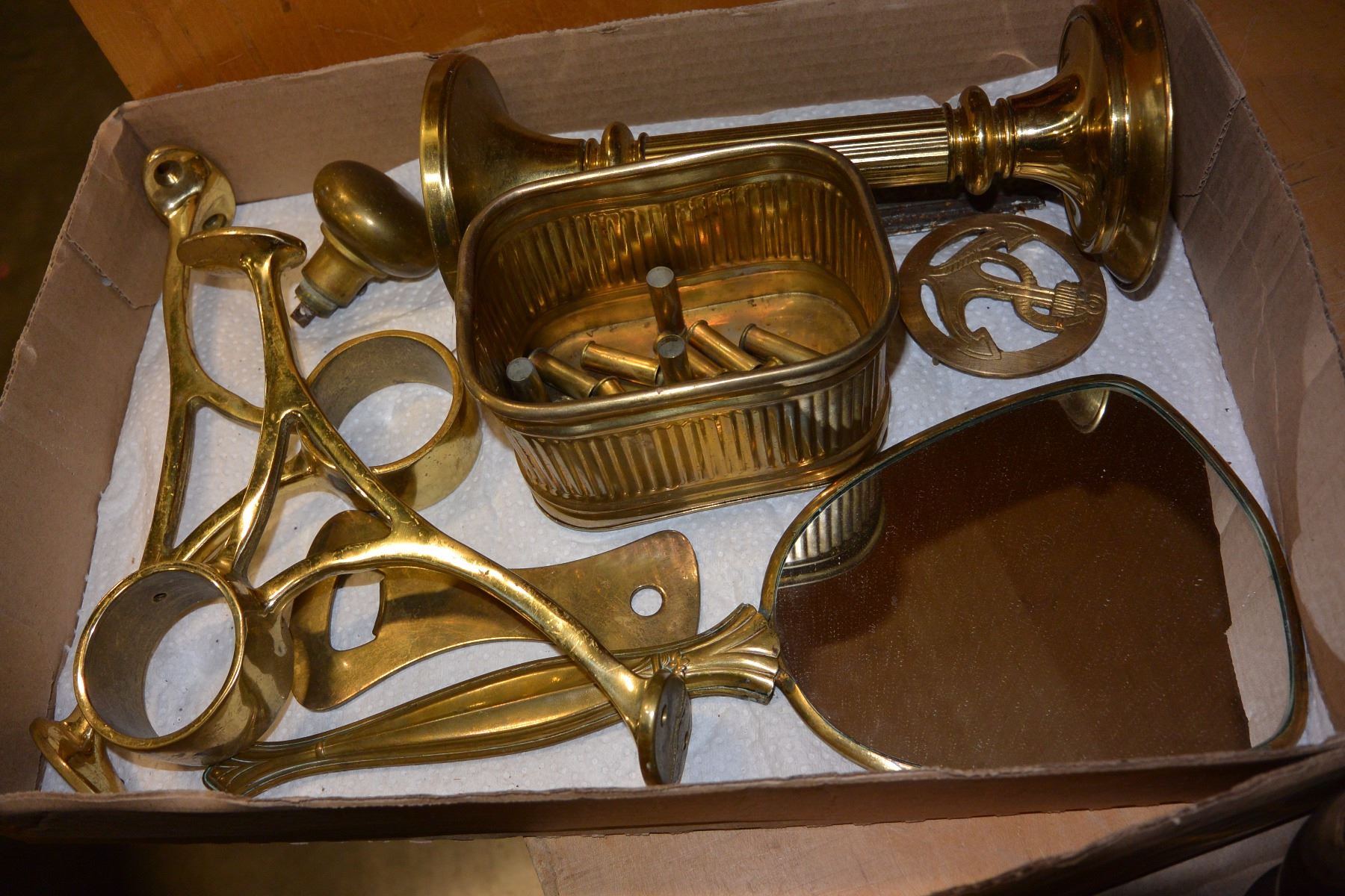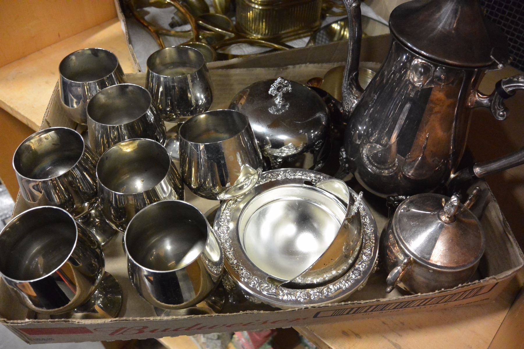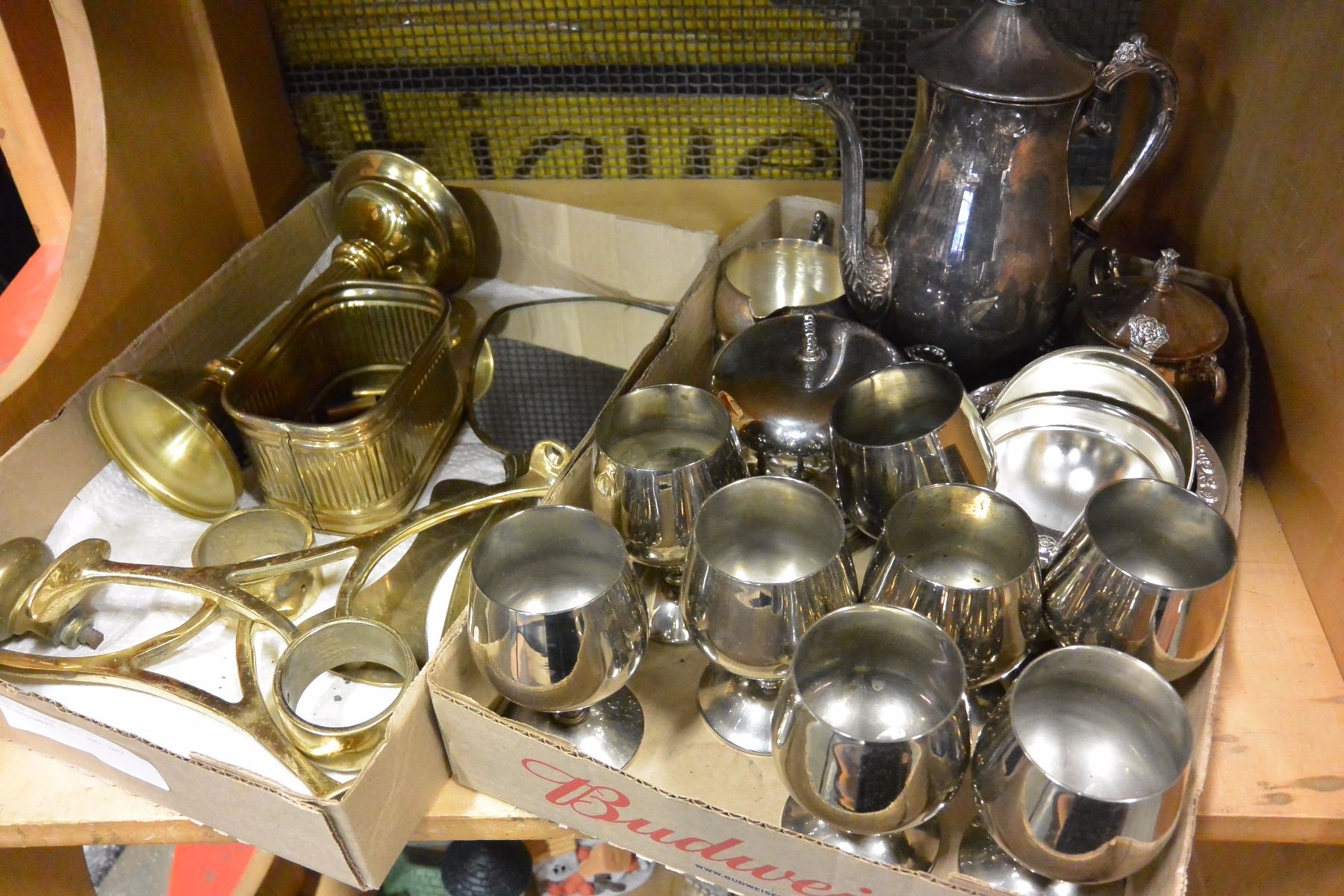 TRAY OF SILVER PLATE AND TRAY OF BRASSWARE