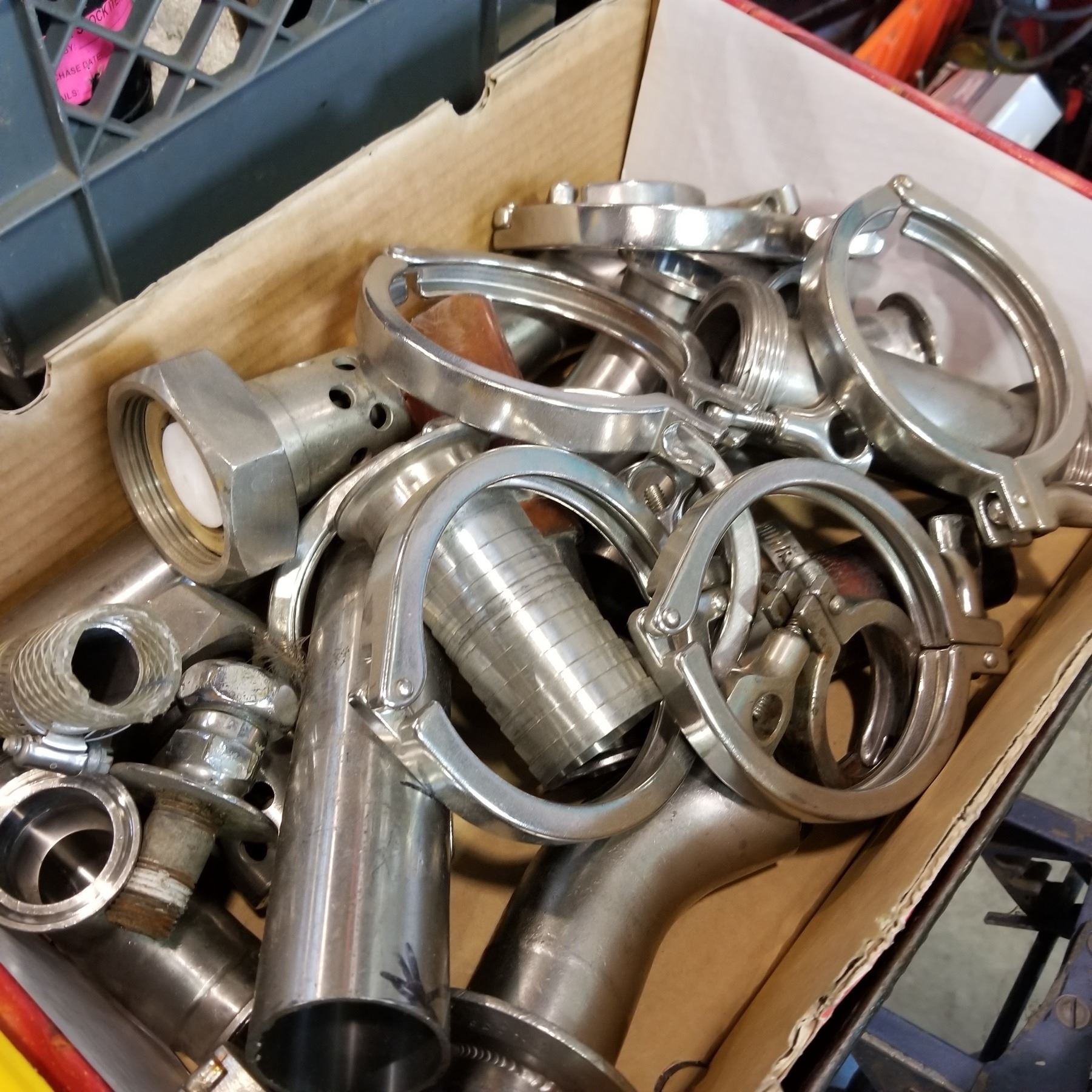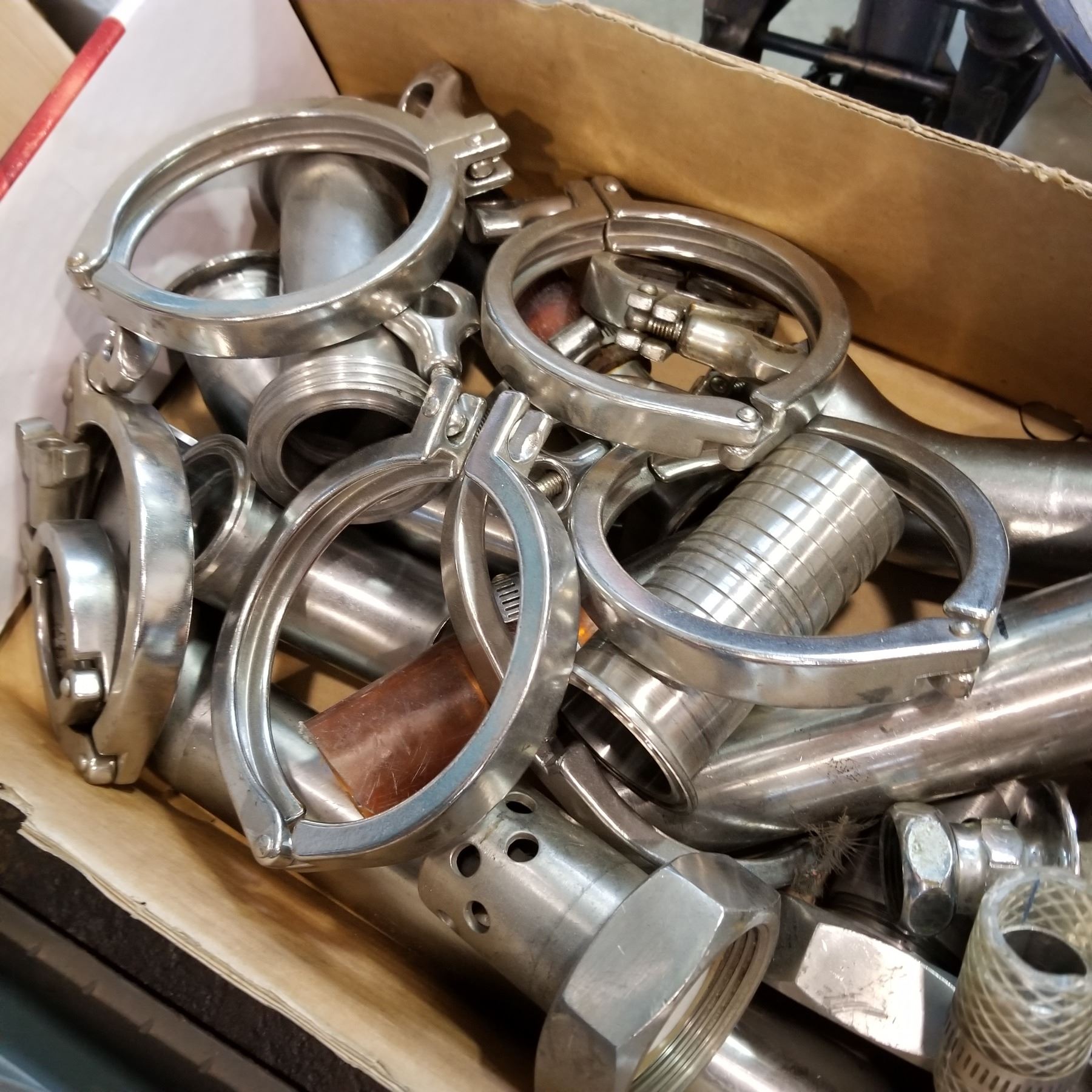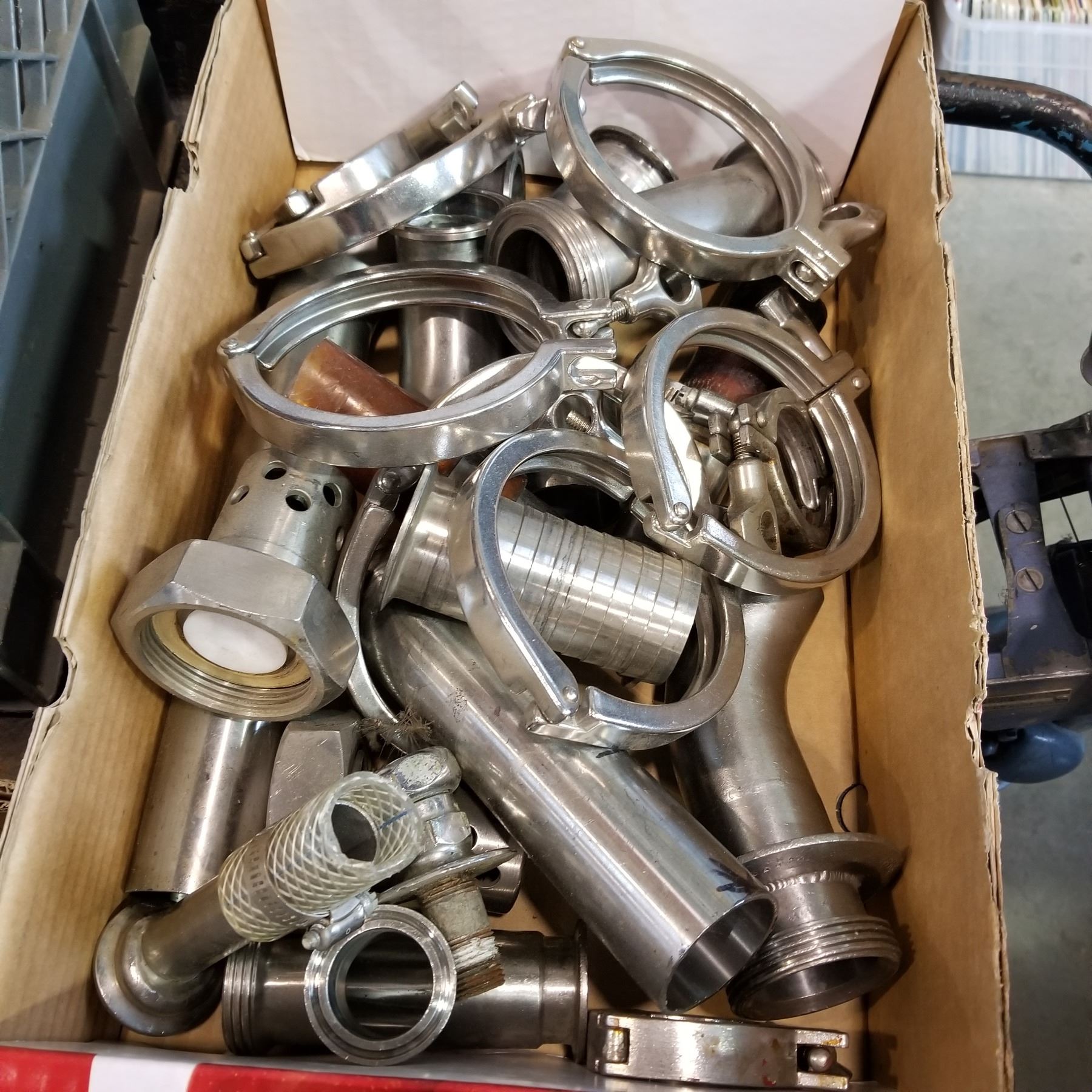 TRAY OF STAINLESS STEEL PIPE CLAMPS AND MORE