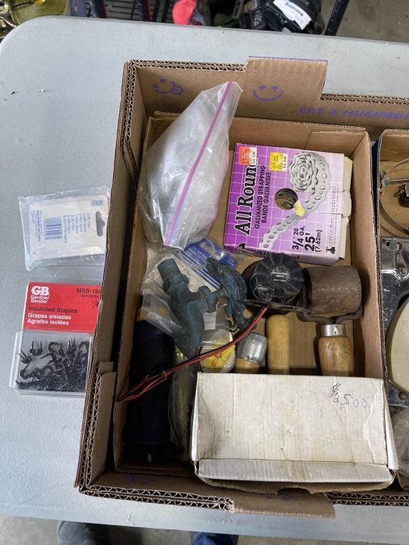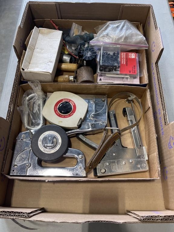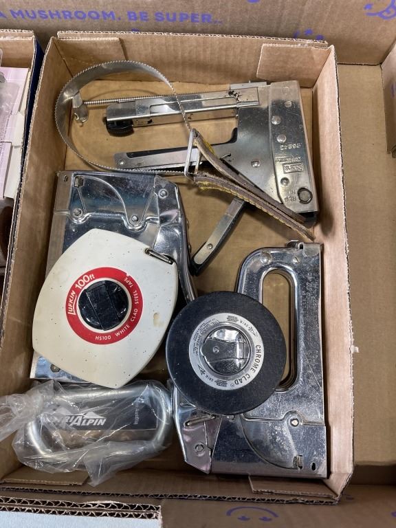 TRAY OF STAPLERS, TAPE MEASURERS, GLAVANIZED STRAPPING
