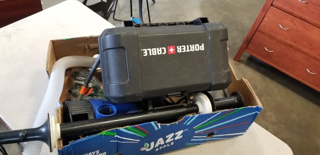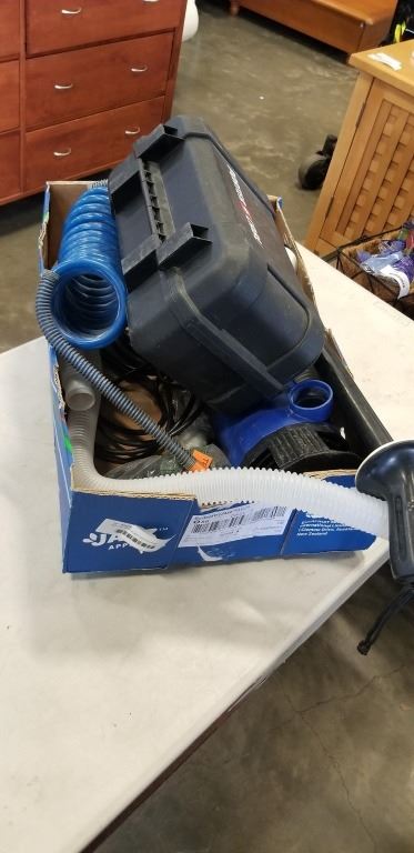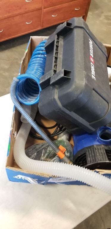 TRAY OF SUMP PUMP, WATER HOSE, SHRINK WRAP HANDLE AND MORE