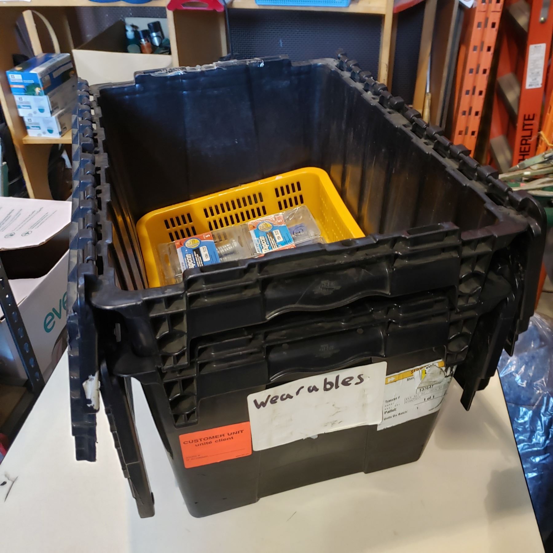 TRAY OF TAP CAN CONCRETE ANCHORS AND 2 TOTES WITH BUILT IN LIDS