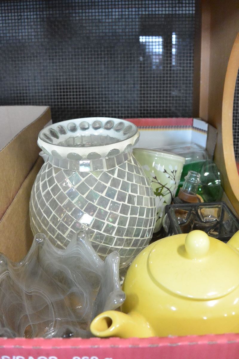 TRAY OF TEAPOTS AND COLLECTIBLES ETC